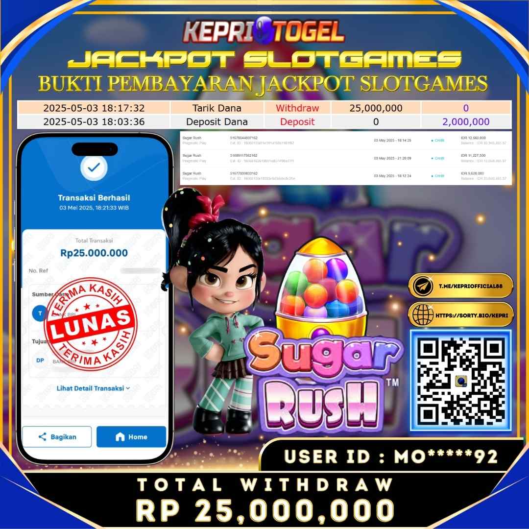 Selamat kepada UserId MO*****92 telah berhasil mendapatkan kemenangan jackpot pada permainan Slot SUGAR RUSH Kepritogel sebesar Rp25,000,000,- . Kepritogel situs terpercaya sejak dulu hingga saat ini , Untuk kemenangan berapapun pasti akan kami bayarkan . Jangan ragu bermain di Kepri Togel . Kami pihak Kepritogel Menyampaikan terima kasih kepada seluruh member Kepri Togel yang telah Percaya dan setia Bersama kami bermain di Kepritogel hingga saat ini.