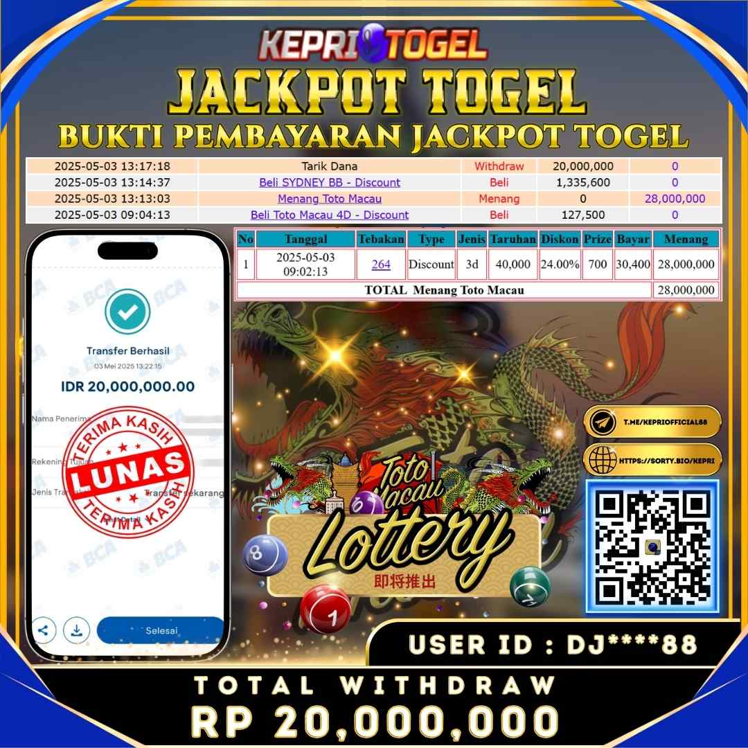 Selamat kepada UserId DJ****88 telah berhasil mendapatkan kemenangan jackpot pada permainan Togel TOTO MACAU 4D Kepritogel sebesar Rp20,000,000,- . Kepritogel situs terpercaya sejak dulu hingga saat ini , Untuk kemenangan berapapun pasti akan kami bayarkan, Jangan ragu bermain di Kepri Togel, Kami pihak Kepritogel menyampaikan terima kasih kepada seluruh member Kepri Togel yang telah Percaya dan setia bersama kami bermain di Kepritogel hingga saat ini.