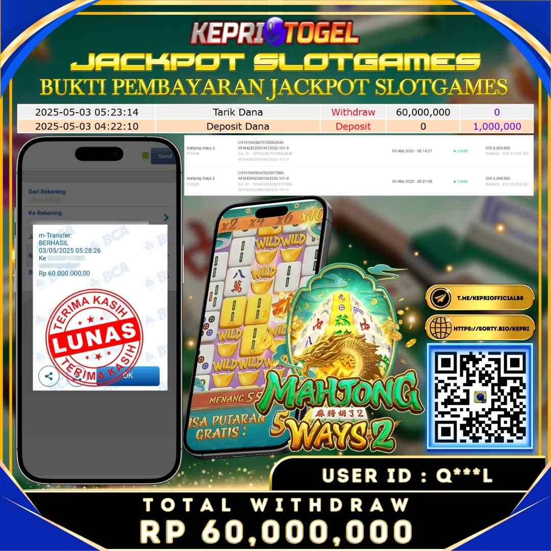 Selamat kepada UserId Q***L telah berhasil mendapatkan kemenangan jackpot pada permainan Slot Mahjong Ways2 Kepritogel sebesar Rp60,000,000,- . Kepritogel situs terpercaya sejak dulu hingga saat ini , Untuk kemenangan berapapun pasti akan kami bayarkan . Jangan ragu bermain di Kepri Togel . Kami pihak Kepritogel Menyampaikan terima kasih kepada seluruh member Kepri Togel yang telah Percaya dan setia Bersama kami bermain di Kepritogel hingga saat ini.