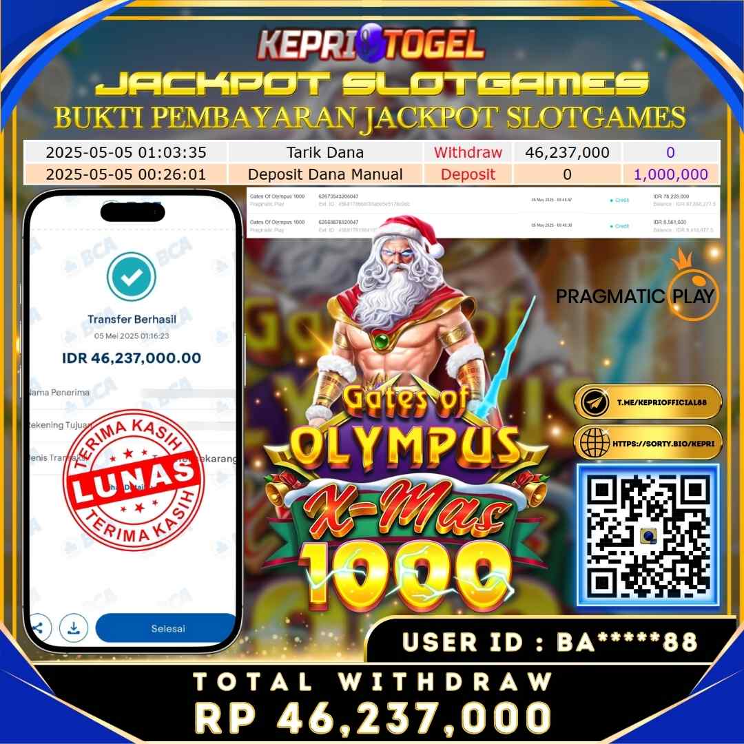Selamat kepada UserId BA*****88 telah berhasil mendapatkan kemenangan jackpot pada permainan Slot Gates Of Olympus X-mas 1000 Kepritogel sebesar Rp46,237,000,- . Kepritogel situs terpercaya sejak dulu hingga saat ini , Untuk kemenangan berapapun pasti akan kami bayarkan . Jangan ragu bermain di Kepri Togel . Kami pihak Kepritogel Menyampaikan terima kasih kepada seluruh member Kepri Togel yang telah Percaya dan setia Bersama kami bermain di Kepritogel hingga saat ini.
