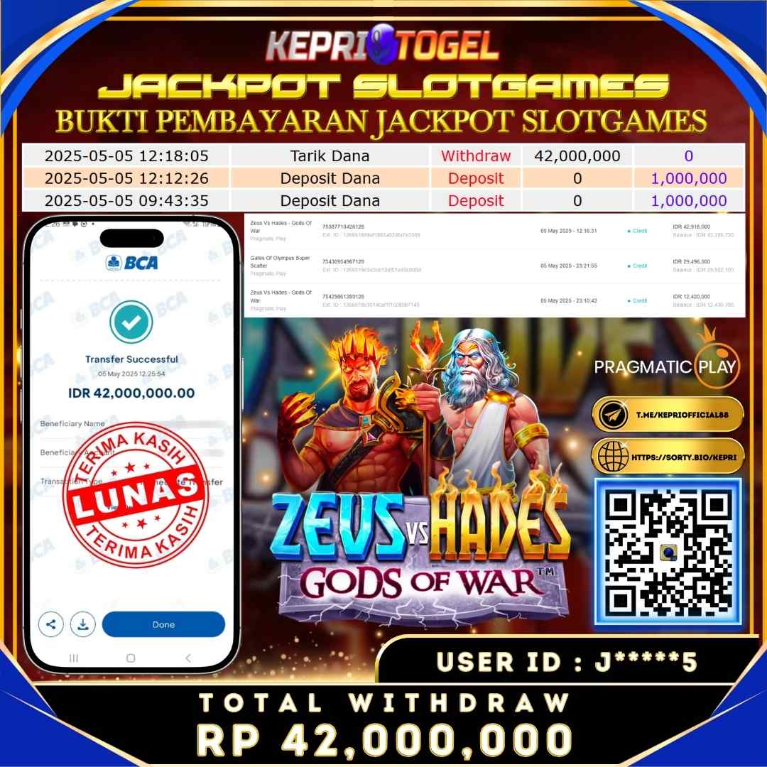 Selamat kepada UserId J*****5 telah berhasil mendapatkan kemenangan jackpot pada permainan Slot Zeus Vs Hades - Gods Of War Kepritogel sebesar Rp42,000,000,- . Kepritogel situs terpercaya sejak dulu hingga saat ini , Untuk kemenangan berapapun pasti akan kami bayarkan . Jangan ragu bermain di Kepri Togel . Kami pihak Kepritogel Menyampaikan terima kasih kepada seluruh member Kepri Togel yang telah Percaya dan setia Bersama kami bermain di Kepritogel hingga saat ini