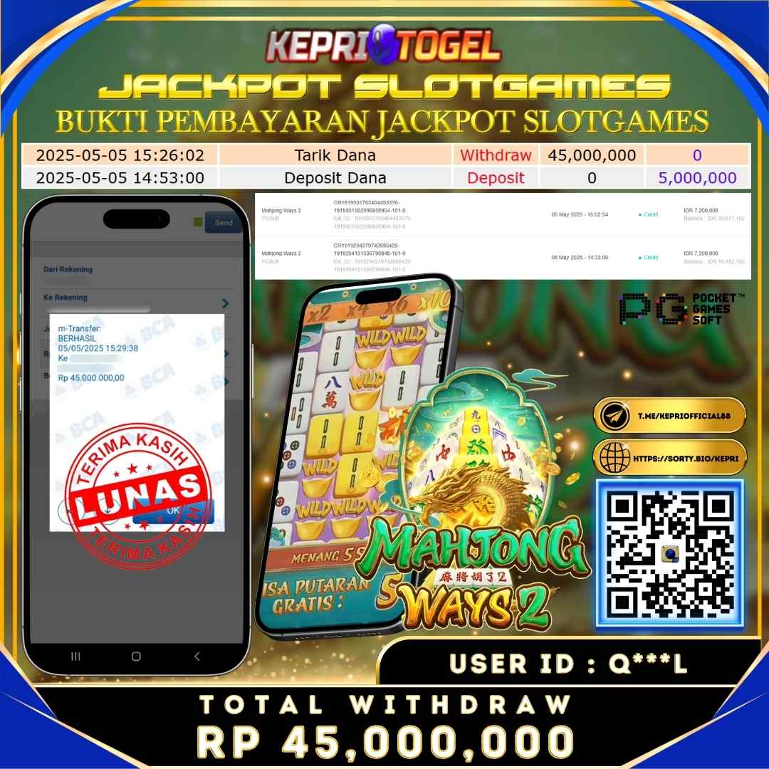 Selamat kepada UserId Q***L telah berhasil mendapatkan kemenangan jackpot pada permainan Slot Mahjong Ways2 Kepritogel sebesar Rp45,000,000,- . Kepritogel situs terpercaya sejak dulu hingga saat ini , Untuk kemenangan berapapun pasti akan kami bayarkan . Jangan ragu bermain di Kepri Togel . Kami pihak Kepritogel Menyampaikan terima kasih kepada seluruh member Kepri Togel yang telah Percaya dan setia Bersama kami bermain di Kepritogel hingga saat ini.
