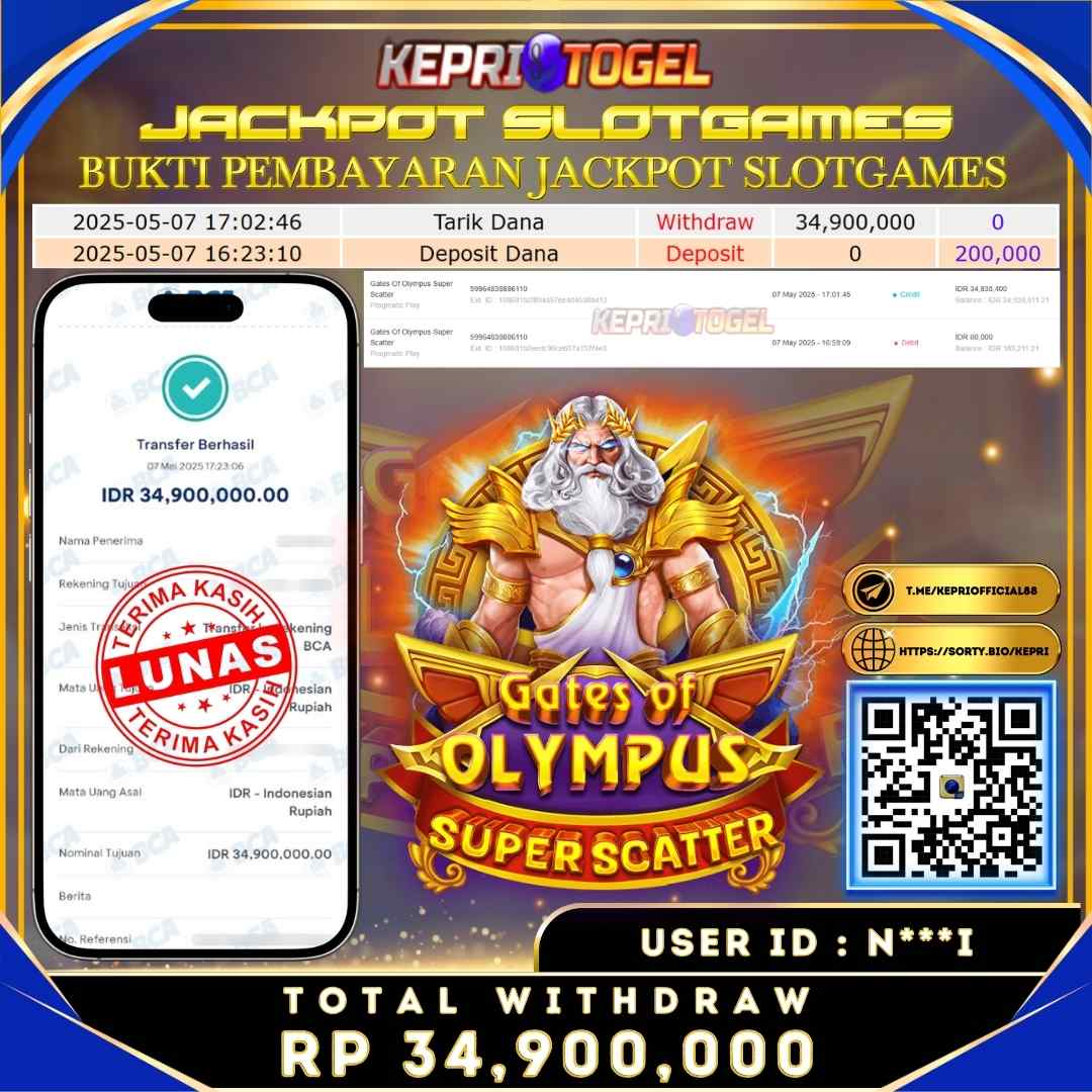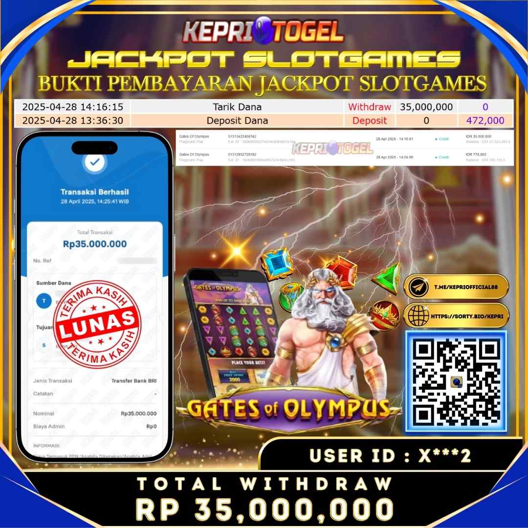 Selamat kepada UserId X***2 telah berhasil mendapatkan kemenangan jackpot pada permainan Slot Gates OF Olympus Kepritogel sebesar Rp35,000,000,- . Kepritogel situs terpercaya sejak dulu hingga saat ini , Untuk kemenangan berapapun pasti akan kami bayarkan . Jangan ragu bermain di Kepri Togel . Kami pihak Kepritogel Menyampaikan terima kasih kepada seluruh member Kepri Togel yang telah Percaya dan setia Bersama kami bermain di Kepritogel hingga saat ini.