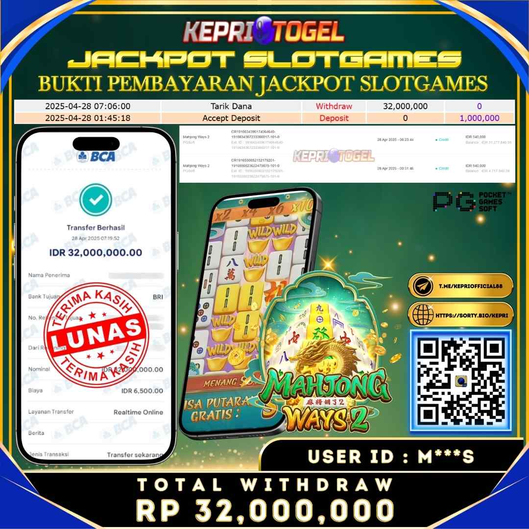 Selamat kepada UserId M***S telah berhasil mendapatkan kemenangan jackpot pada permainan Slot Mahjong Ways2 Kepritogel sebesar Rp32,000,000,- . Kepritogel situs terpercaya sejak dulu hingga saat ini , Untuk kemenangan berapapun pasti akan kami bayarkan . Jangan ragu bermain di Kepri Togel . Kami pihak Kepritogel Menyampaikan terima kasih kepada seluruh member Kepri Togel yang telah Percaya dan setia Bersama kami bermain di Kepritogel hingga saat ini.