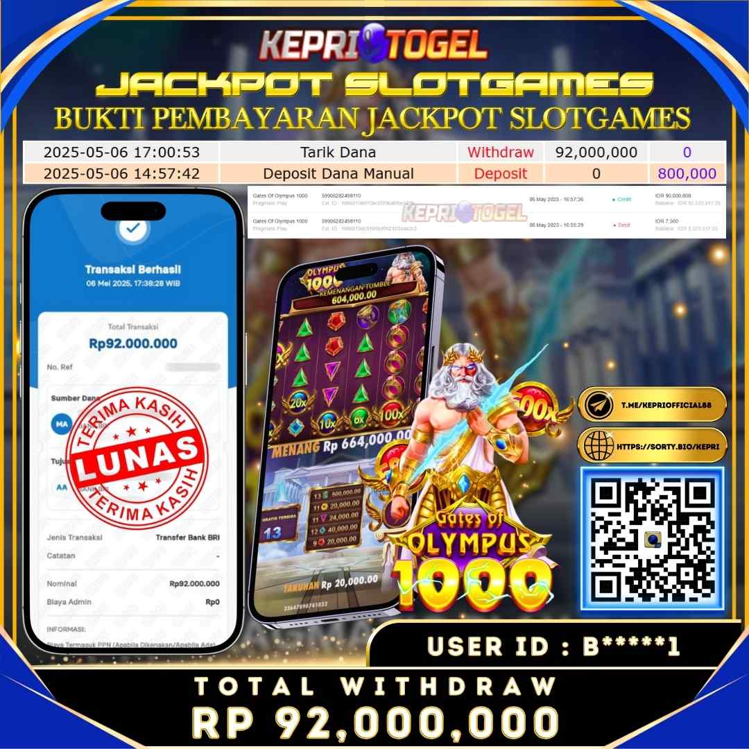 Selamat kepada UserId B*****1 telah berhasil mendapatkan kemenangan jackpot pada permainan Slot Gates OF olympus 1000 Kepritogel sebesar Rp92,000,000,- . Kepritogel situs terpercaya sejak dulu hingga saat ini , Untuk kemenangan berapapun pasti akan kami bayarkan . Jangan ragu bermain di Kepri Togel . Kami pihak Kepritogel Menyampaikan terima kasih kepada seluruh member Kepri Togel yang telah Percaya dan setia Bersama kami bermain di Kepritogel hingga saat ini.