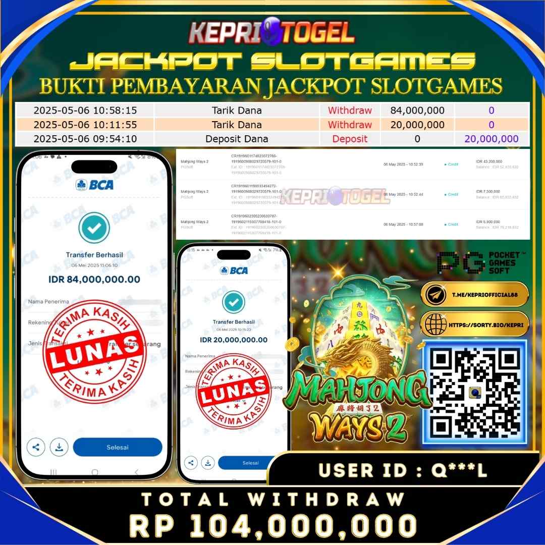 Selamat kepada UserId Q***L telah berhasil mendapatkan kemenangan jackpot pada permainan Slot Mahjong Ways2 Kepritogel sebesar Rp104,000,000,- . Kepritogel situs terpercaya sejak dulu hingga saat ini , Untuk kemenangan berapapun pasti akan kami bayarkan . Jangan ragu bermain di Kepri Togel . Kami pihak Kepritogel Menyampaikan terima kasih kepada seluruh member Kepri Togel yang telah Percaya dan setia Bersama kami bermain di Kepritogel hingga saat ini.