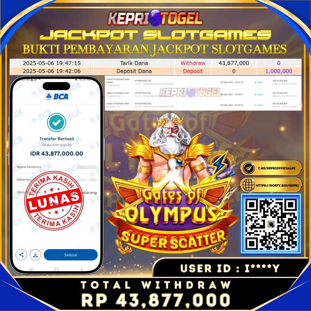Selamat kepada UserId I****Y telah berhasil mendapatkan kemenangan jackpot pada permainan Slot Gates Of Olympus Super Scatter Kepritogel sebesar Rp43,877,000,- . Kepritogel situs terpercaya sejak dulu hingga saat ini , Untuk kemenangan berapapun pasti akan kami bayarkan . Jangan ragu bermain di Kepri Togel . Kami pihak Kepritogel Menyampaikan terima kasih kepada seluruh member Kepri Togel yang telah Percaya dan setia Bersama kami bermain di Kepritogel hingga saat ini.