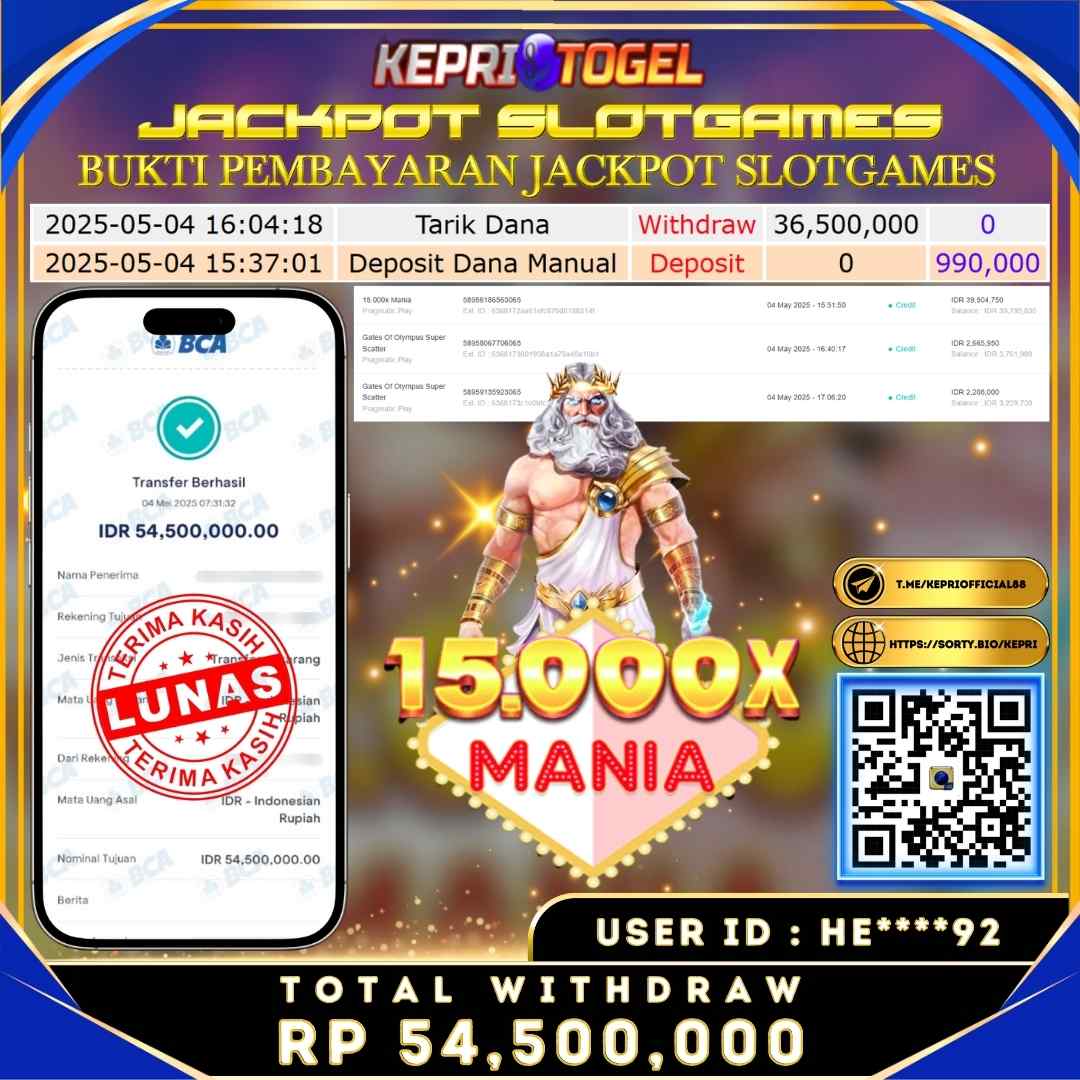 Selamat kepada UserId HE****92 telah berhasil mendapatkan kemenangan jackpot pada permainan MANIA 15000X Kepritogel sebesar Rp54,500,000,- . Kepritogel situs terpercaya sejak dulu hingga saat ini , Untuk kemenangan berapapun pasti akan kami bayarkan . Jangan ragu bermain di Kepri Togel . Kami pihak Kepritogel Menyampaikan terima kasih kepada seluruh member Kepri Togel yang telah Percaya dan setia Bersama kami bermain di Kepritogel