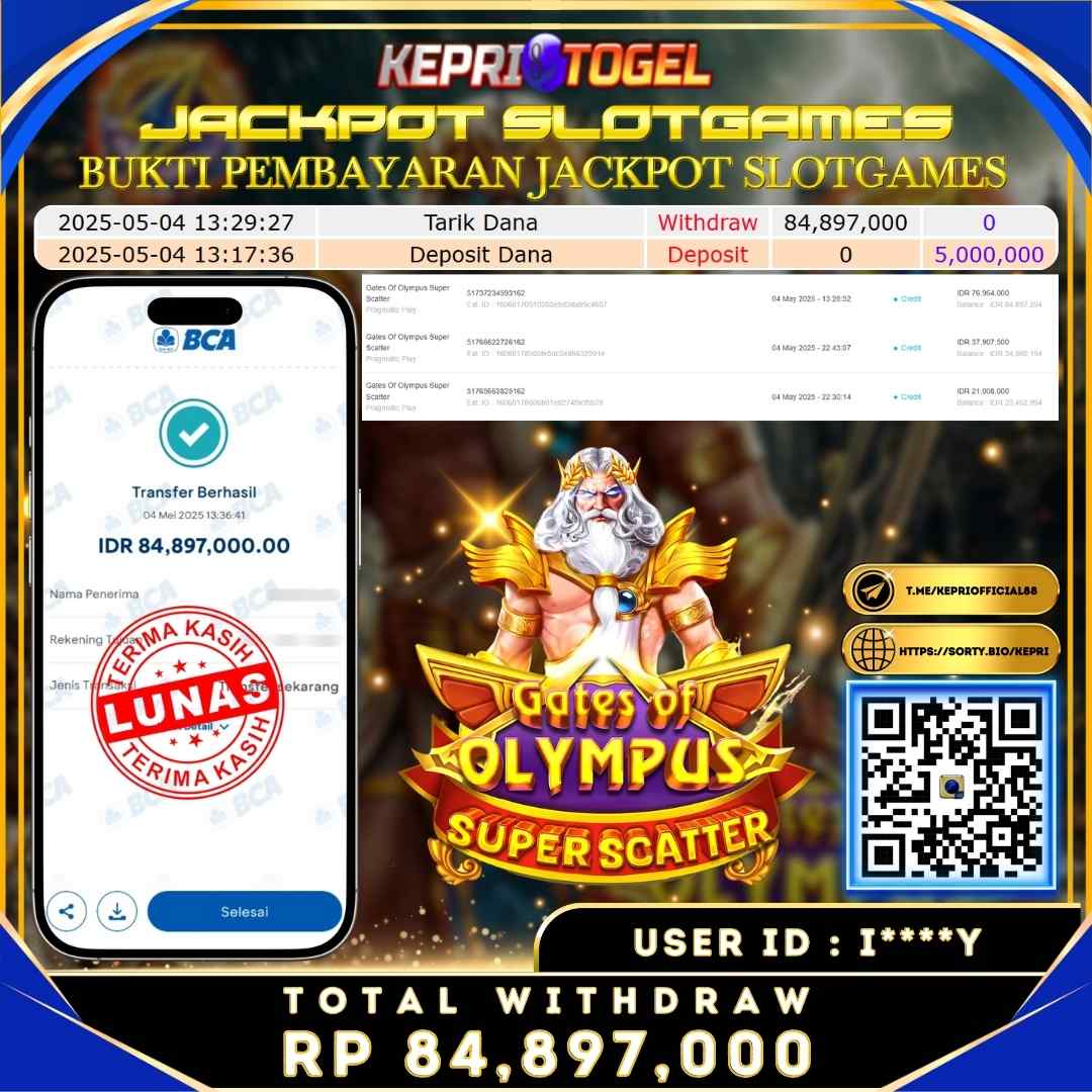 Selamat kepada UserId I****Y telah berhasil mendapatkan kemenangan jackpot pada permainan Slot Gates Of Olympus Super Scatter Kepritogel sebesar Rp84,897,000,- . Kepritogel situs terpercaya sejak dulu hingga saat ini , Untuk kemenangan berapapun pasti akan kami bayarkan . Jangan ragu bermain di Kepri Togel . Kami pihak Kepritogel Menyampaikan terima kasih kepada seluruh member Kepri Togel yang telah Percaya dan setia Bersama kami bermain di Kepritogel hingga saat ini.