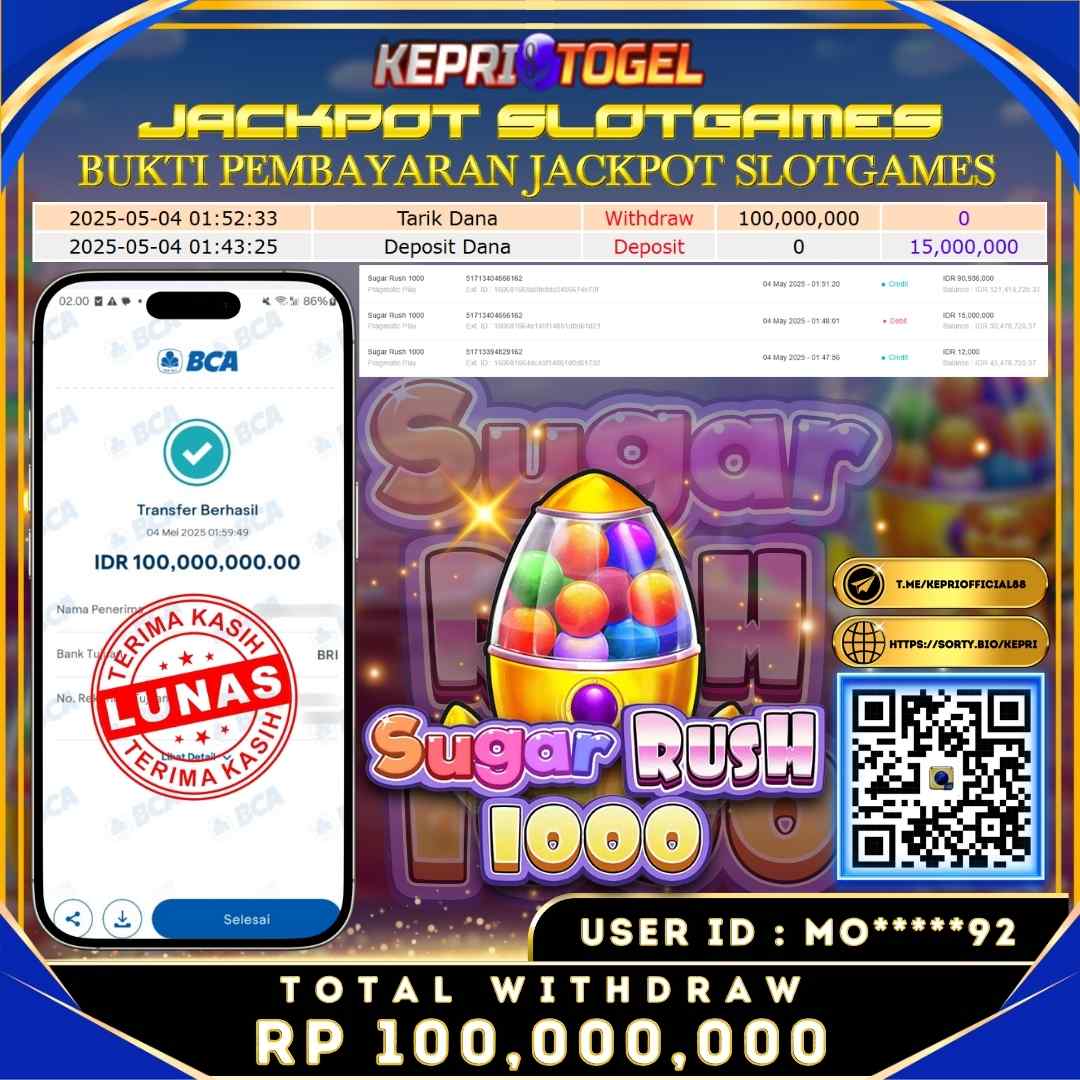Selamat kepada UserId MO*****92 telah berhasil mendapatkan kemenangan jackpot pada permainan Slot Sugar Rush 1000 Kepritogel sebesar Rp100,000,000,- . Kepritogel situs terpercaya sejak dulu hingga saat ini , Untuk kemenangan berapapun pasti akan kami bayarkan . Jangan ragu bermain di Kepri Togel . Kami pihak Kepritogel Menyampaikan terima kasih kepada seluruh member Kepri Togel yang telah Percaya dan setia Bersama kami bermain di Kepritogel hingga saat ini.