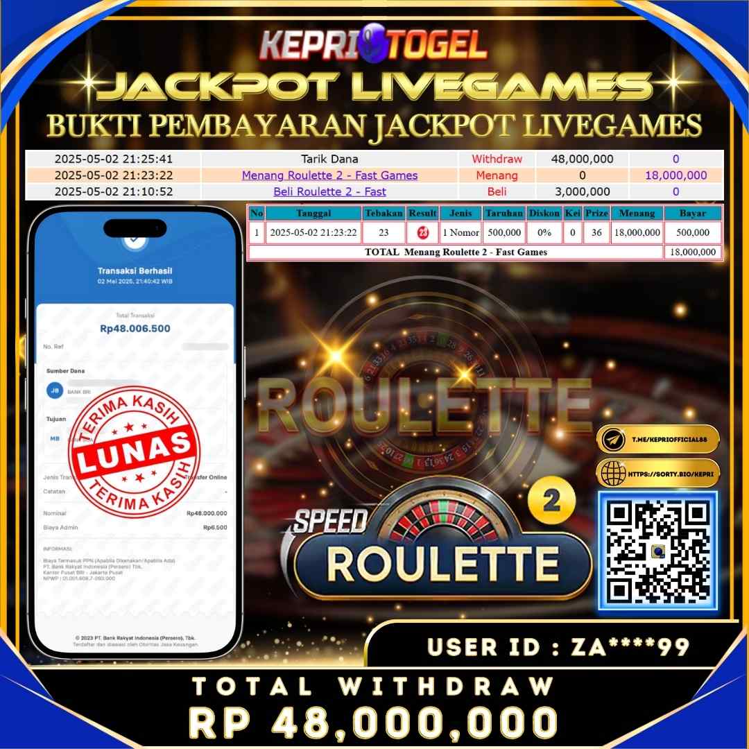 Selamat kepada UserId ZA****99 telah berhasil mendapatkan kemenangan jackpot pada permainan Live Game ROULETTE Kepritogel sebesar Rp48,000,000,- . Kepritogel situs terpercaya sejak dulu hingga saat ini , Untuk kemenangan berapapun pasti akan kami bayarkan . Jangan ragu bermain di Kepri Togel . Kami pihak Kepritogel Menyampaikan terima kasih kepada seluruh member Kepri Togel yang telah Percaya dan setia Bersama kami bermain di Kepritogel hingga saat ini.