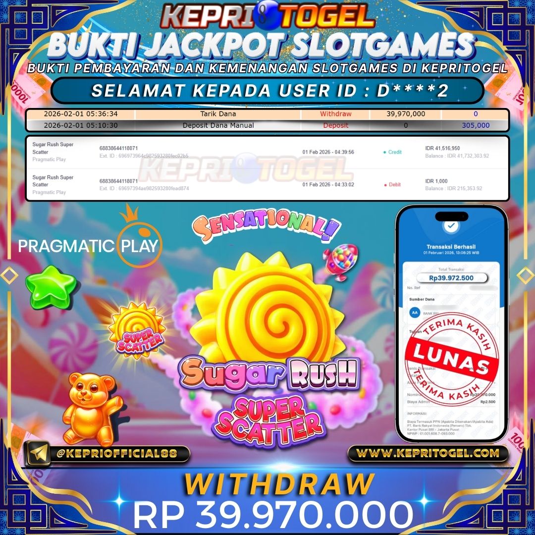 Selamat kepada UserId D****2 telah berhasil mendapatkan kemenangan jackpot pada permainan Slot Sugar Rush Super Scatter Kepritogel sebesar Rp39,970,000,- . Kepritogel situs terpercaya sejak dulu hingga saat ini , Untuk kemenangan berapapun pasti akan kami bayarkan . Jangan ragu bermain di Kepri Togel . Kami pihak Kepritogel Menyampaikan terima kasih kepada seluruh member Kepri Togel yang telah Percaya dan setia Bersama kami bermain di Kepritogel hingga saat ini.