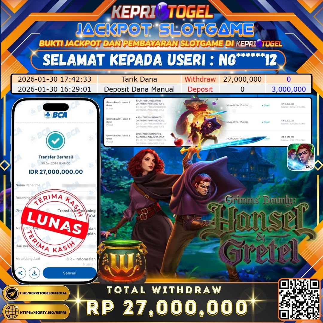 Selamat kepada UserId NG******12 telah berhasil mendapatkan kemenangan jackpot pada permainan Slot Grimms Bounty: Hansel & Gretel Kepritogel sebesar Rp27,000,000,- . Kepritogel situs terpercaya sejak dulu hingga saat ini , Untuk kemenangan berapapun pasti akan kami bayarkan . Jangan ragu bermain di Kepri Togel . Kami pihak Kepritogel Menyampaikan terima kasih kepada seluruh member Kepri Togel yang telah Percaya dan setia Bersama kami bermain di Kepritogel hingga saat ini.