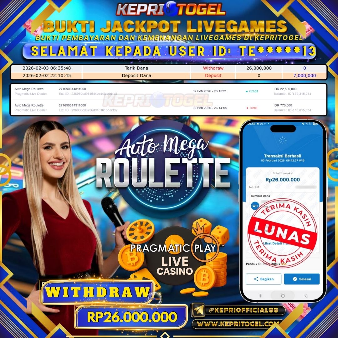 Kepritogel Jackpot Live Game Auto Mega Roulette Rp26,000,000
