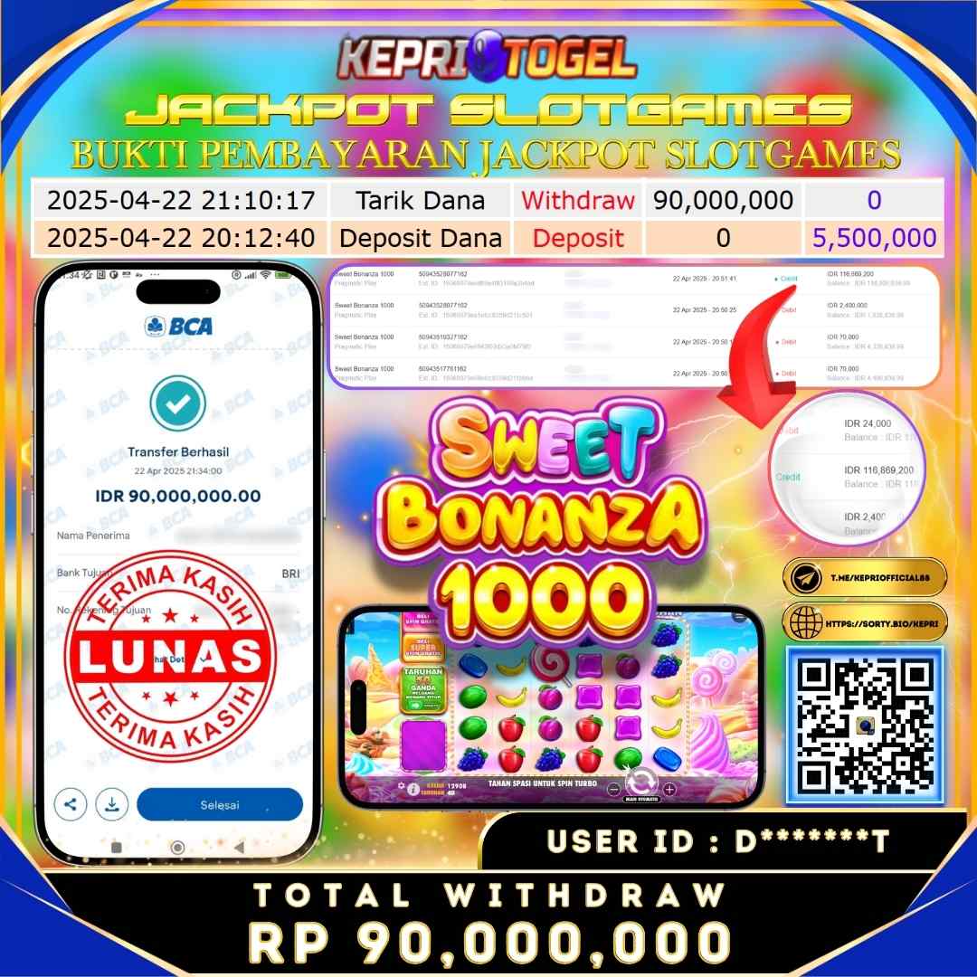 Selamat kepada UserId e******3 telah berhasil mendapatkan kemenangan jackpot pada permainan Sweet Bonanza 1000 Kepritogel sebesar Rp40,000,000,- . Kepritogel situs terpercaya sejak dulu hingga saat ini , Untuk kemenangan berapapun pasti akan kami bayarkan . Jangan ragu bermain di Kepri Togel . Kami pihak Kepritogel Menyampaikan terima kasih kepada seluruh member Kepri Togel yang telah Percaya dan setia Bersama kami bermain di Kepritogel hingga saat ini.