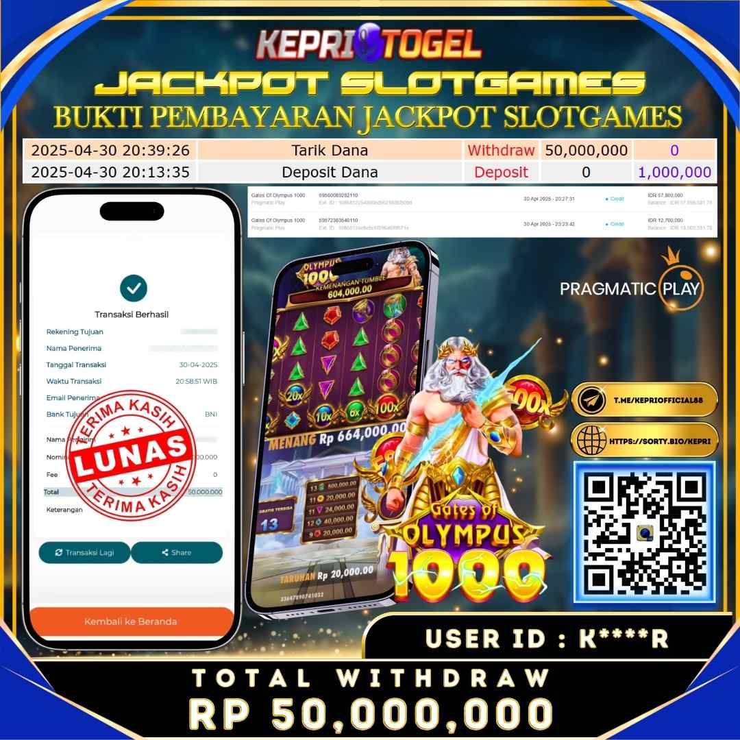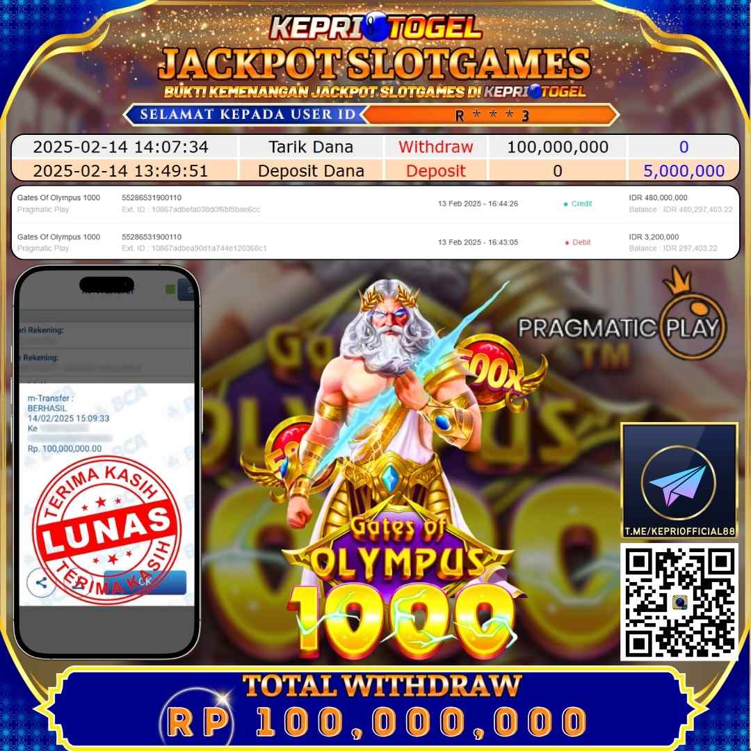 Selamat kepada UserId r***3 telah berhasil mendapatkan kemenangan jackpot pada permainan Gates Of Olympus 1000 Kepritogel sebesar Rp100,000,000,- . Kepritogel situs terpercaya sejak dulu hingga saat ini , Untuk kemenangan berapapun pasti akan kami bayarkan . Jangan ragu bermain di Kepri Togel . Kami pihak Kepritogel Menyampaikan terima kasih kepada seluruh member Kepri Togel yang telah Percaya dan setia Bersama kami bermain di Kepritogel hingga saat ini.