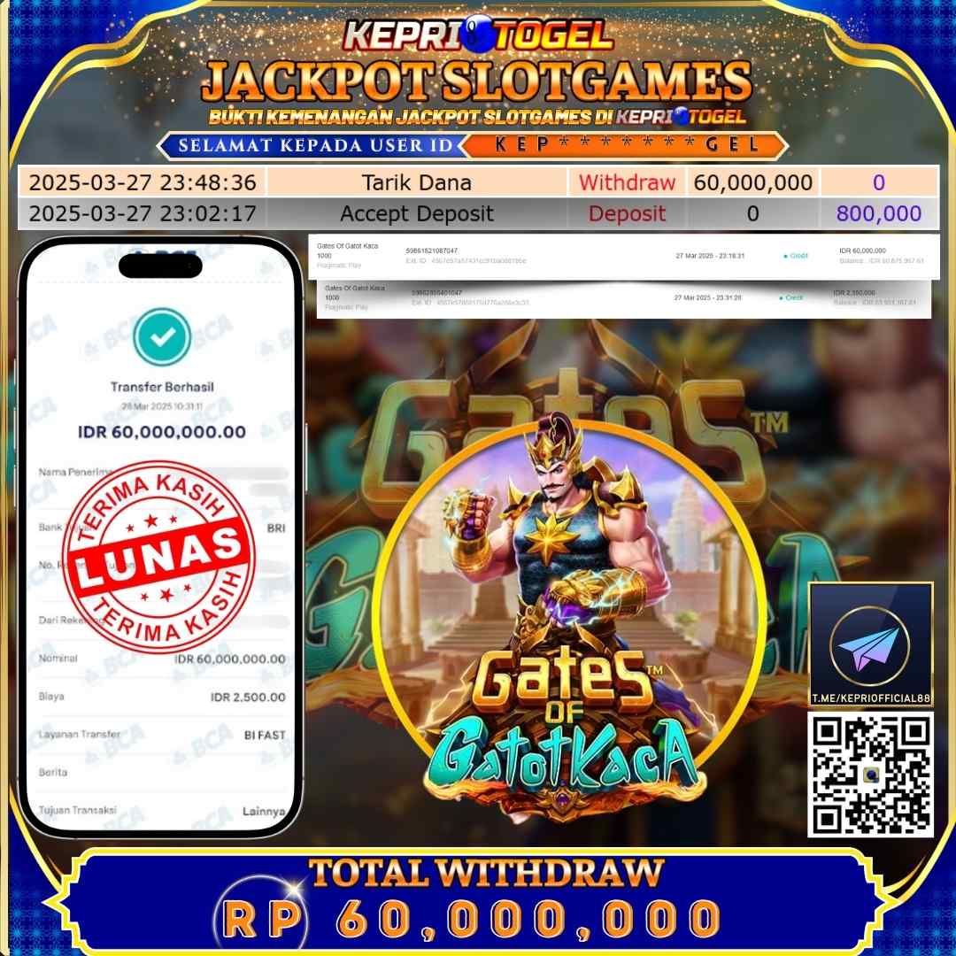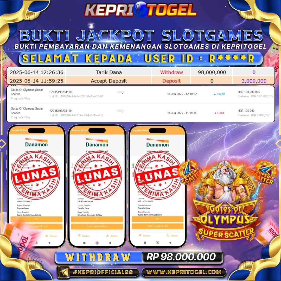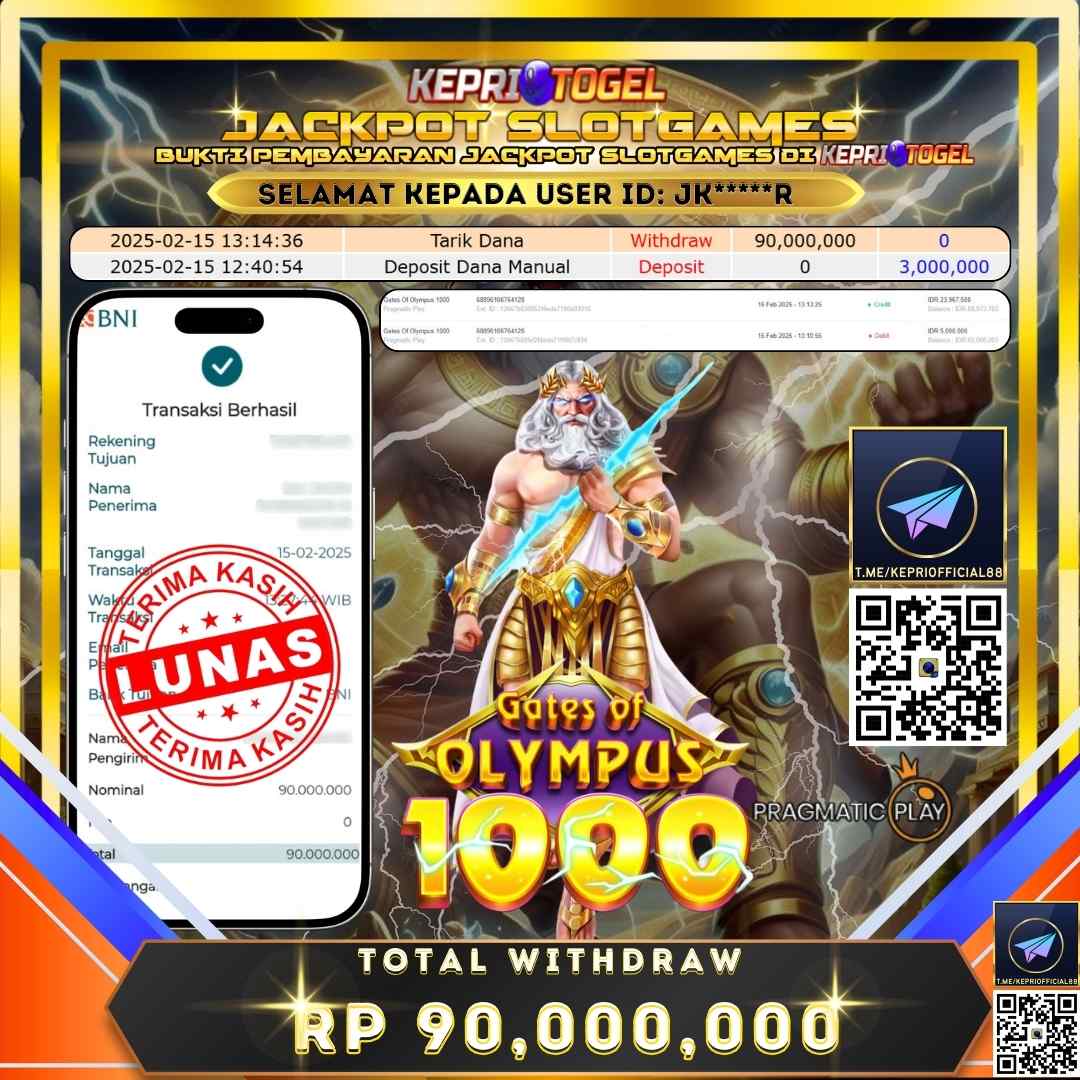 Selamat kepada UserId JK*****R telah berhasil mendapatkan kemenangan jackpot pada permainan Gates Of Olympus 1000 Kepritogel sebesar Rp88,000,000,- . Kepritogel situs terpercaya sejak dulu hingga saat ini , Untuk kemenangan berapapun pasti akan kami bayarkan . Jangan ragu bermain di Kepri Togel . Kami pihak Kepritogel Menyampaikan terima kasih kepada seluruh member Kepri Togel yang telah Percaya dan setia Bersama kami bermain di Kepritogel hingga saat ini.