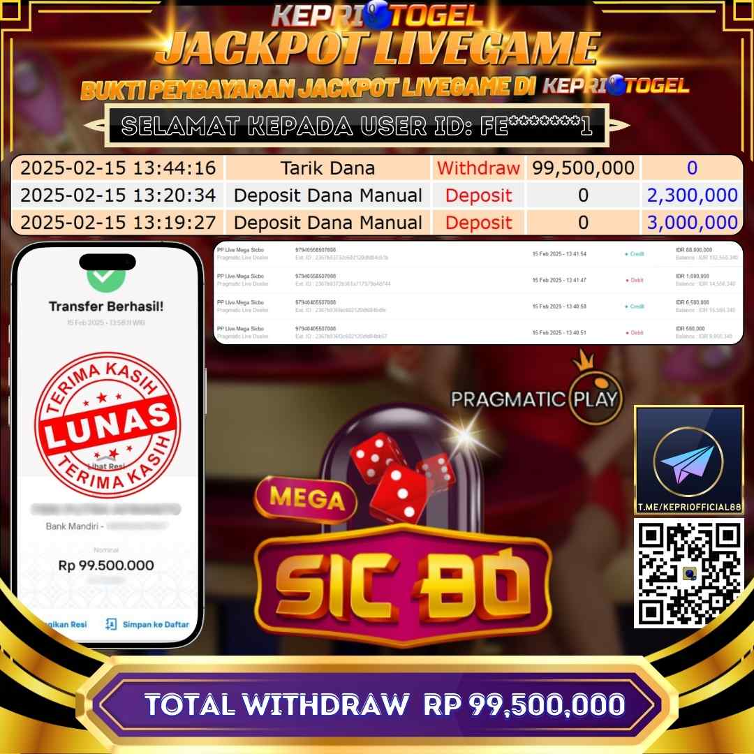 Selamat kepada UserId fe*******1 telah berhasil mendapatkan kemenangan jackpot pada permainan Live Game MEGA SICBO Kepritogel sebesar Rp99,500,000,- . Kepritogel situs terpercaya sejak dulu hingga saat ini , Untuk kemenangan berapapun pasti akan kami bayarkan . Jangan ragu bermain di Kepri Togel . Kami pihak Kepritogel Menyampaikan terima kasih kepada seluruh member Kepri Togel yang telah Percaya dan setia Bersama kami bermain di Kepritogel hingga saat inI.