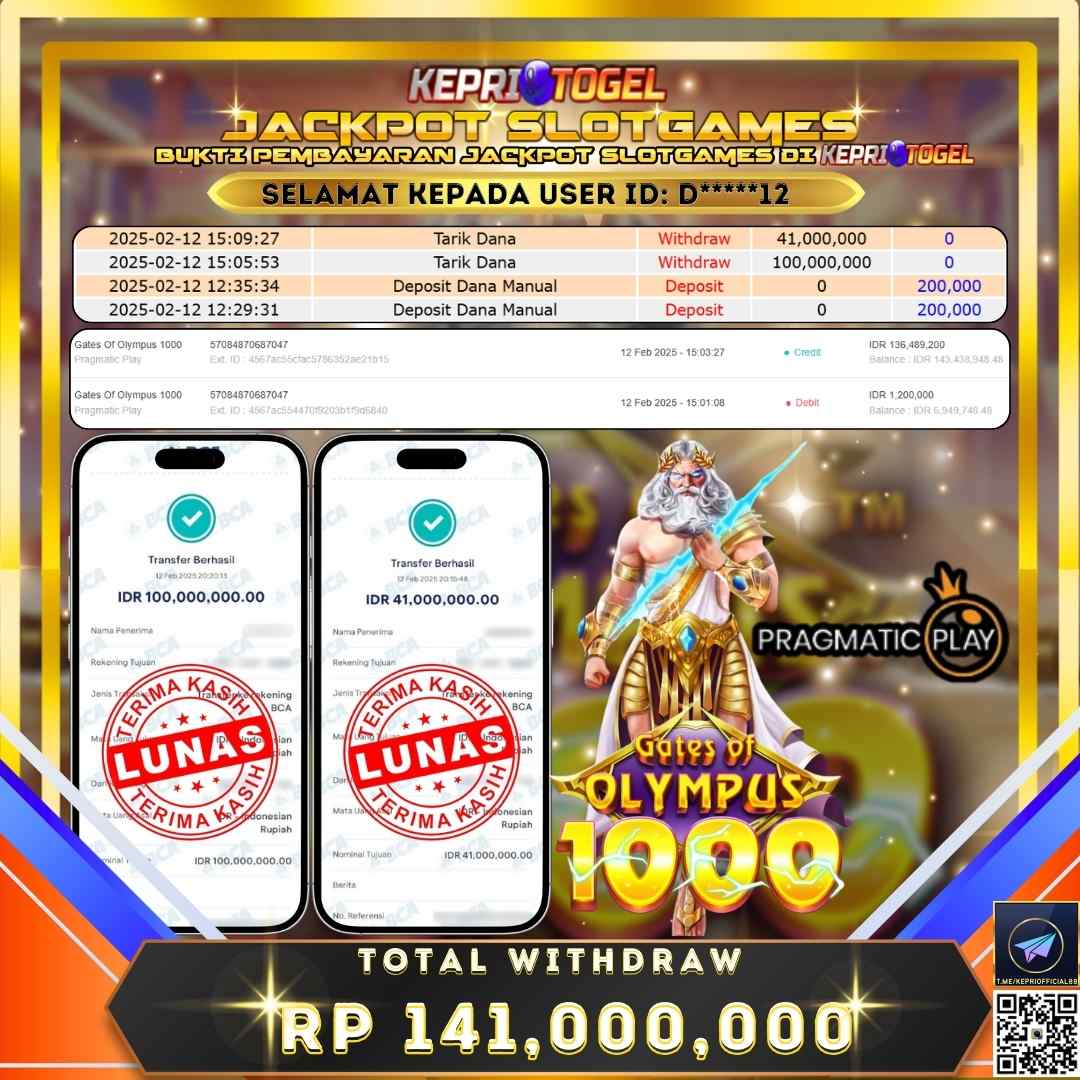 Selamat kepada UserId d*****12 telah berhasil mendapatkan kemenangan jackpot pada permainan Gates Of Olympus 1000 Kepritogel sebesar Rp141,000,000,- . Kepritogel situs terpercaya sejak dulu hingga saat ini , Untuk kemenangan berapapun pasti akan kami bayarkan . Jangan ragu bermain di Kepri Togel . Kami pihak Kepritogel Menyampaikan terima kasih kepada seluruh member Kepri Togel yang telah Percaya dan setia Bersama kami bermain di Kepritogel hingga saat ini.
