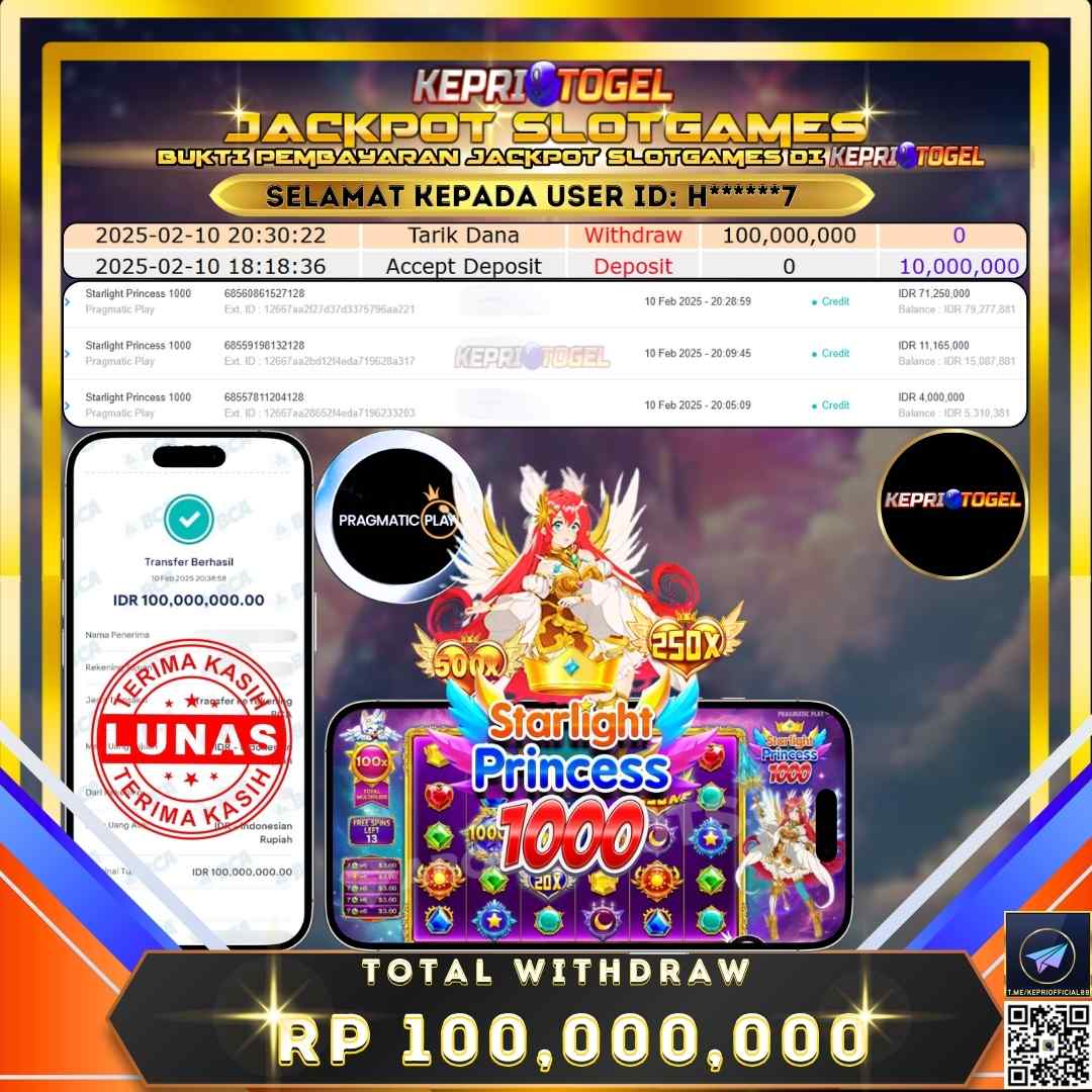 Selamat kepada UserId h******7 telah berhasil mendapatkan kemenangan jackpot pada permainan Slot Starlight Princess 1000 Kepritogel sebesar Rp100,000,000,- . Kepritogel situs terpercaya sejak dulu hingga saat ini , Untuk kemenangan berapapun pasti akan kami bayarkan . Jangan ragu bermain di Kepri Togel . Kami pihak Kepritogel Menyampaikan terima kasih kepada seluruh member Kepri Togel yang telah Percaya dan setia Bersama kami bermain di Kepritogel hingga saat ini.