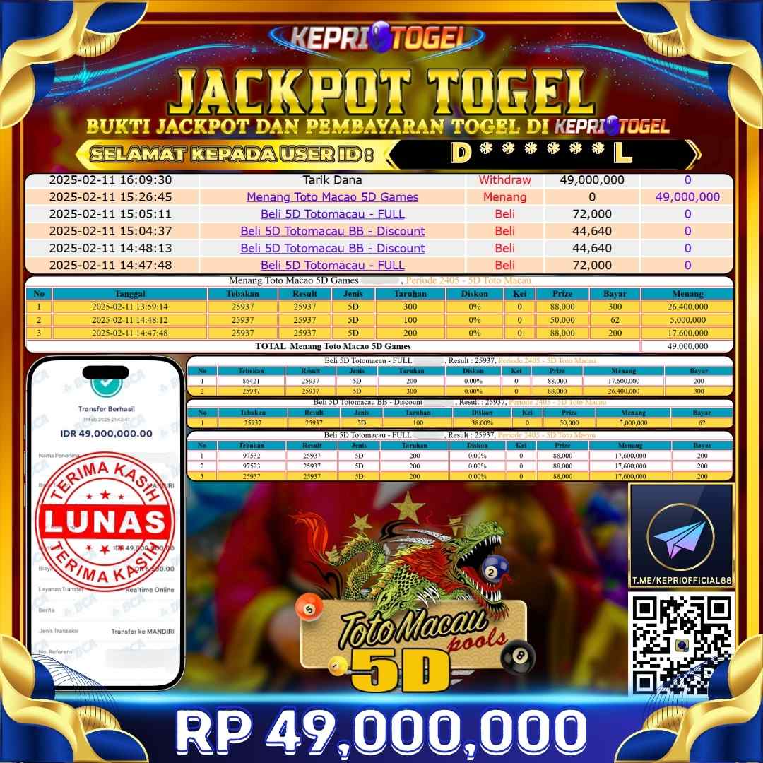 Kepritogel Jackpot Togel TOTO MACAO 5D Rp49,000,000