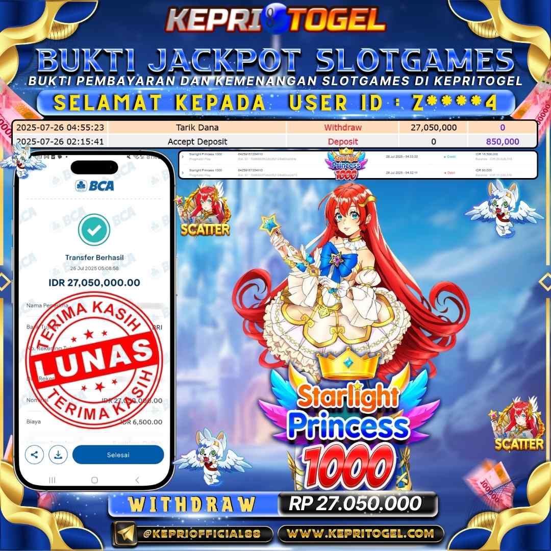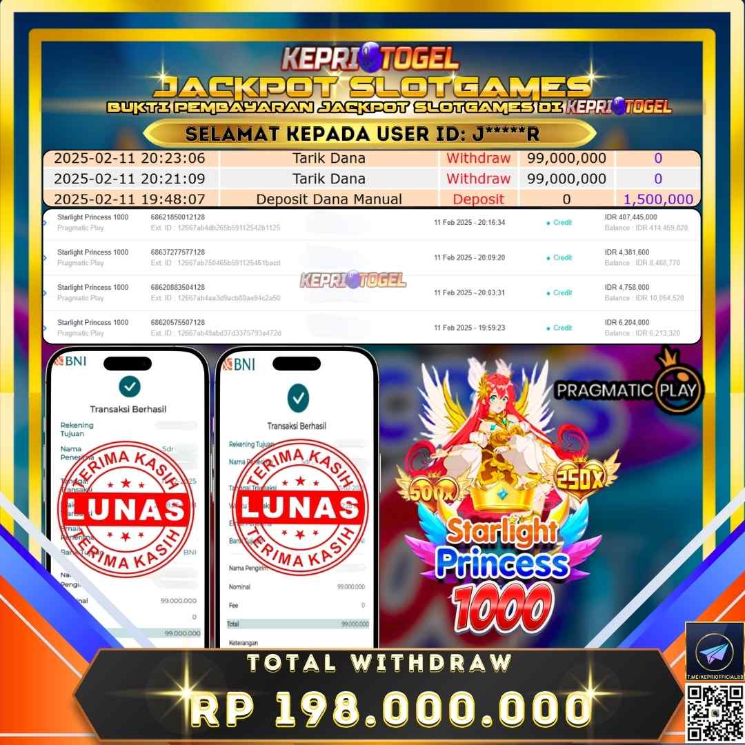 Selamat kepada UserId j*****r telah berhasil mendapatkan kemenangan jackpot pada permainan Slot Starlight Princess 1000 Kepritogel sebesar Rp198,000,000,- . Kepritogel situs terpercaya sejak dulu hingga saat ini , Untuk kemenangan berapapun pasti akan kami bayarkan . Jangan ragu bermain di Kepri Togel . Kami pihak Kepritogel Menyampaikan terima kasih kepada seluruh member Kepri Togel yang telah Percaya dan setia Bersama kami bermain di Kepritogel hingga saat ini.