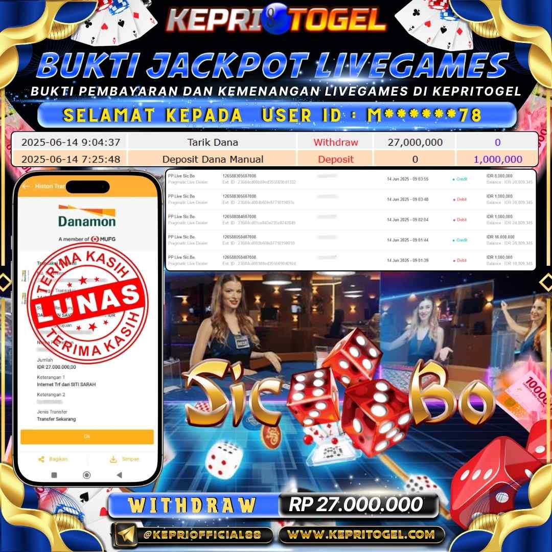 Selamat kepada UserId kr******29 telah berhasil mendapatkan kemenangan jackpot pada permainan Live Game PP LIVE BACCARAT A Kepritogel sebesar Rp25,000,000,- . Kepritogel situs terpercaya sejak dulu hingga saat ini , Untuk kemenangan berapapun pasti akan kami bayarkan . Jangan ragu bermain di Kepri Togel . Kami pihak Kepritogel Menyampaikan terima kasih kepada seluruh member Kepri Togel yang telah Percaya dan setia Bersama kami bermain di Kepritogel hingga saat inI.