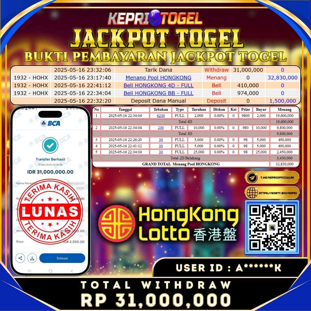 Selamat kepada UserId N******08 telah berhasil mendapatkan kemenangan jackpot pada permainan Slot Mahjong Ways Kepritogel sebesar Rp50,000,000,- . Kepritogel situs terpercaya sejak dulu hingga saat ini , Untuk kemenangan berapapun pasti akan kami bayarkan . Jangan ragu bermain di Kepri Togel . Kami pihak Kepritogel Menyampaikan terima kasih kepada seluruh member Kepri Togel yang telah Percaya dan setia Bersama kami bermain di Kepritogel hingga saat ini.