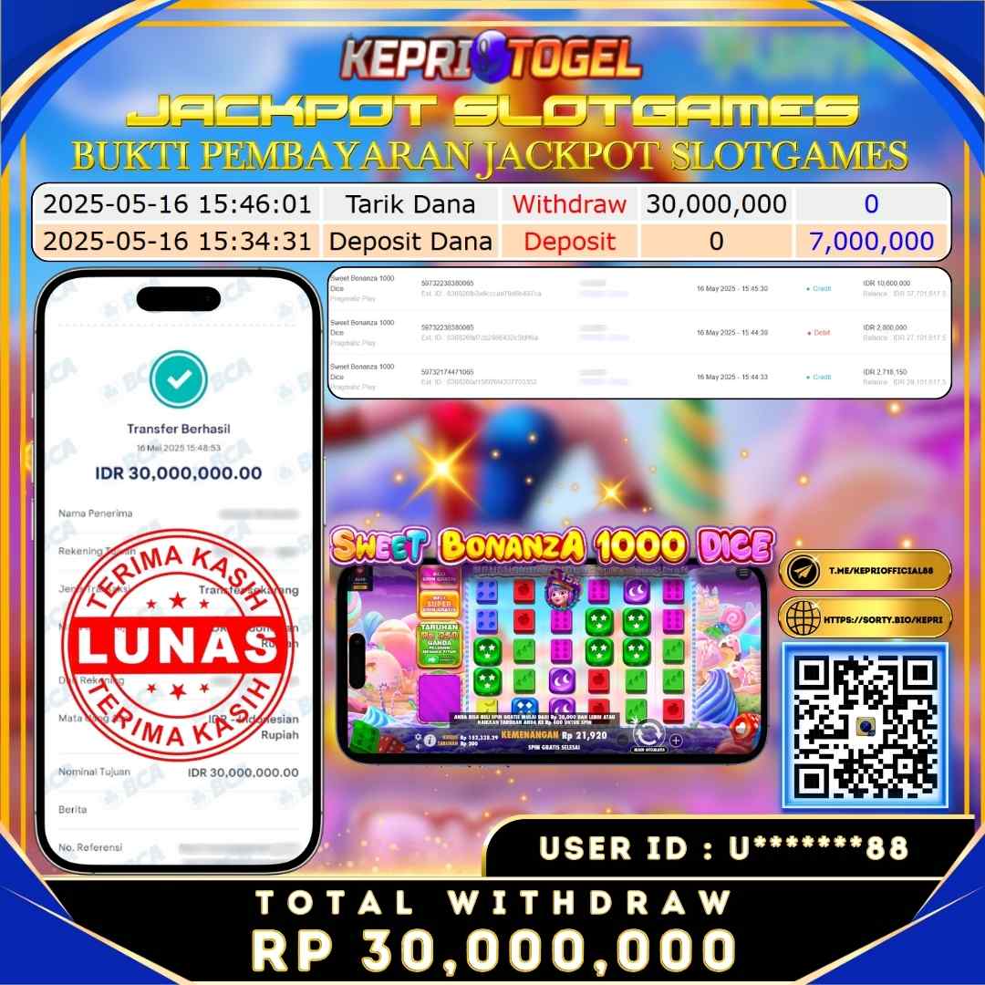 Selamat kepada UserId M******92 telah berhasil mendapatkan kemenangan jackpot pada permainan Slot Sweet Bonanza 1000 Kepritogel sebesar Rp48,000,000,- . Kepritogel situs terpercaya sejak dulu hingga saat ini , Untuk kemenangan berapapun pasti akan kami bayarkan . Jangan ragu bermain di Kepri Togel . Kami pihak Kepritogel Menyampaikan terima kasih kepada seluruh member Kepri Togel yang telah Percaya dan setia Bersama kami bermain di Kepritogel hingga saat ini.