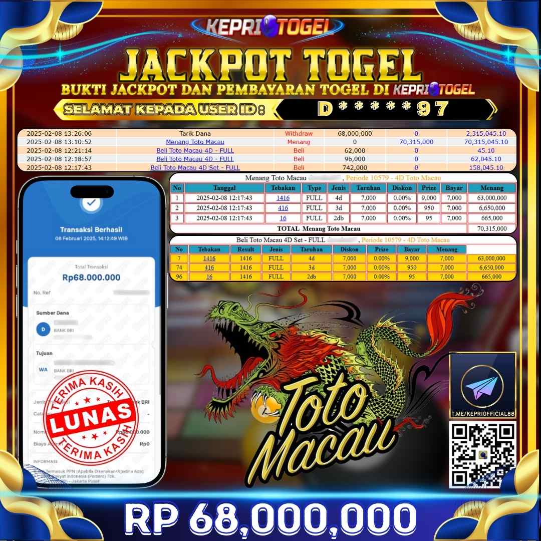 Kepritogel Jackpot Togel TOTO MACAU 4D Rp68,000,000