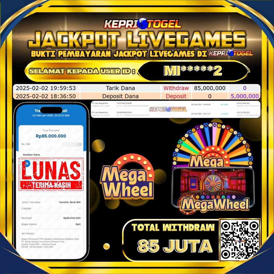 Selamat kepada UserId MI*****2 telah berhasil mendapatkan kemenangan jackpot pada permainan Live Game Live Game PP Live Megawheel Kepritogel sebesar Rp85,000,000,- . Kepritogel situs terpercaya sejak dulu hingga saat ini , Untuk kemenangan berapapun pasti akan kami bayarkan . Jangan ragu bermain di Kepri Togel . Kami pihak Kepritogel Menyampaikan terima kasih kepada seluruh member Kepri Togel yang telah Percaya dan setia Bersama kami bermain di Kepritogel hingga saat inI.