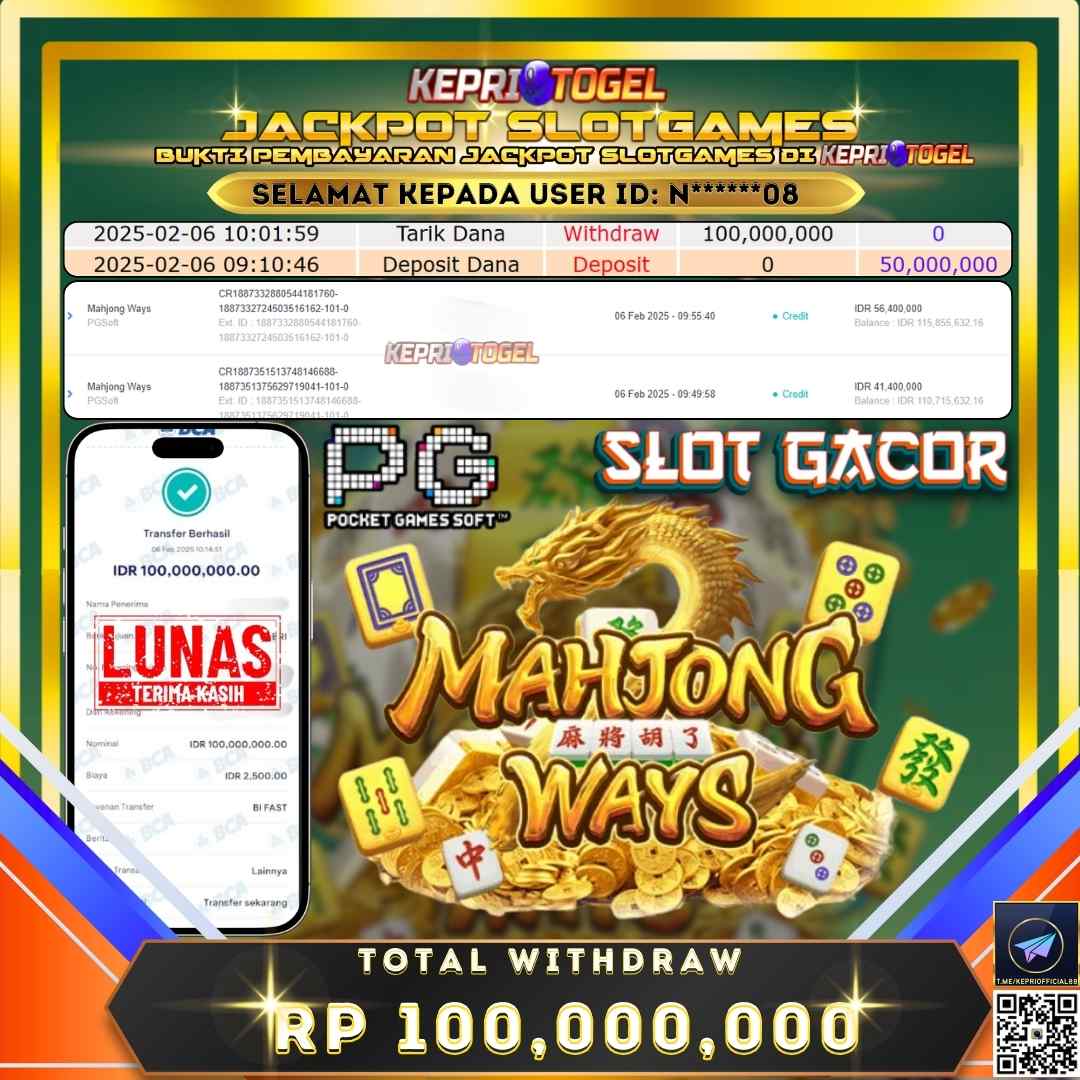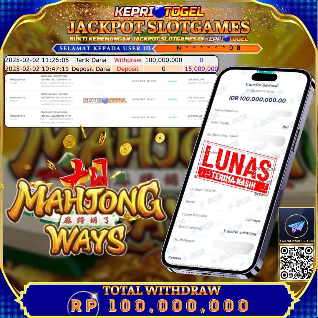 Selamat kepada UserId N******08 telah berhasil mendapatkan kemenangan jackpot pada permainan Slot Mahjong Ways Kepritogel sebesar Rp100,000,000,- . Kepritogel situs terpercaya sejak dulu hingga saat ini , Untuk kemenangan berapapun pasti akan kami bayarkan . Jangan ragu bermain di Kepri Togel . Kami pihak Kepritogel Menyampaikan terima kasih kepada seluruh member Kepri Togel yang telah Percaya dan setia Bersama kami bermain di Kepritogel hingga saat ini.