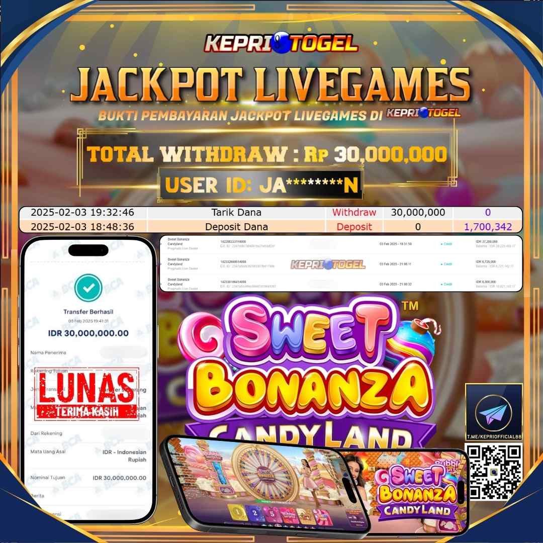 Selamat kepada UserId JA********N telah berhasil mendapatkan kemenangan jackpot pada permainan Slot Sweet Bonanza Candyland Kepritogel sebesar Rp30,000,000,- . Kepritogel situs terpercaya sejak dulu hingga saat ini , Untuk kemenangan berapapun pasti akan kami bayarkan . Jangan ragu bermain di Kepri Togel . Kami pihak Kepritogel Menyampaikan terima kasih kepada seluruh member Kepri Togel yang telah Percaya dan setia Bersama kami bermain di Kepritogel hingga saat ini.