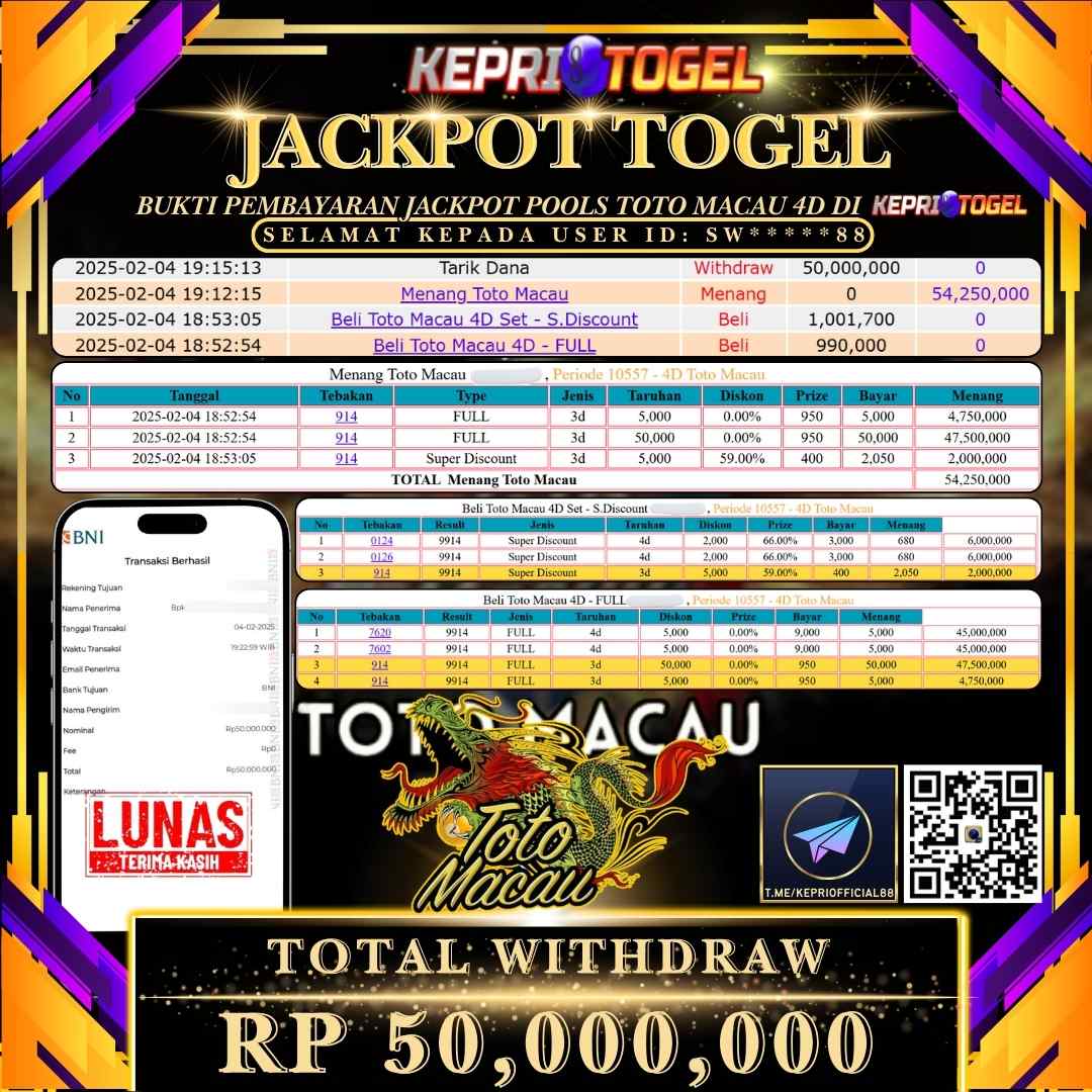 Kepritogel Jackpot Togel TOTO MACAU 4D Rp50,000,000