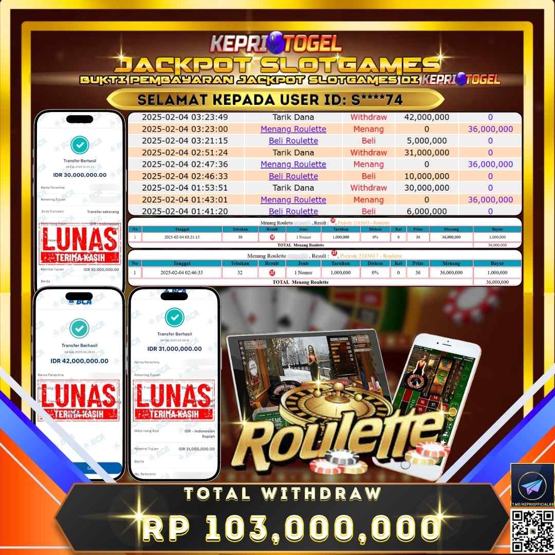 Selamat kepada UserId S****74 telah berhasil mendapatkan kemenangan jackpot pada permainan Live Game Roulette Kepritogel sebesar Rp30,000,000,- . Kepritogel situs terpercaya sejak dulu hingga saat ini , Untuk kemenangan berapapun pasti akan kami bayarkan . Jangan ragu bermain di Kepri Togel . Kami pihak Kepritogel Menyampaikan terima kasih kepada seluruh member Kepri Togel yang telah Percaya dan setia Bersama kami bermain di Kepritogel hingga saat inI.