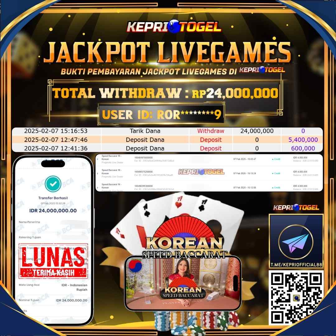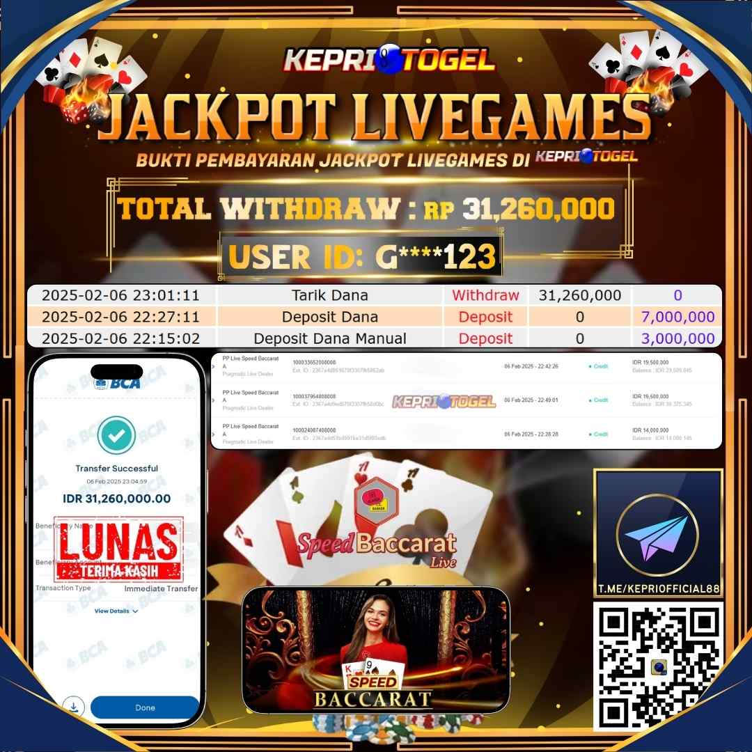 Selamat kepada UserId G****123 telah berhasil mendapatkan kemenangan jackpot pada permainan Live Game PP Live Speed Baccarat A Kepritogel sebesar Rp31,260,000,- . Kepritogel situs terpercaya sejak dulu hingga saat ini , Untuk kemenangan berapapun pasti akan kami bayarkan . Jangan ragu bermain di Kepri Togel . Kami pihak Kepritogel Menyampaikan terima kasih kepada seluruh member Kepri Togel yang telah Percaya dan setia Bersama kami bermain di Kepritogel hingga saat inI.