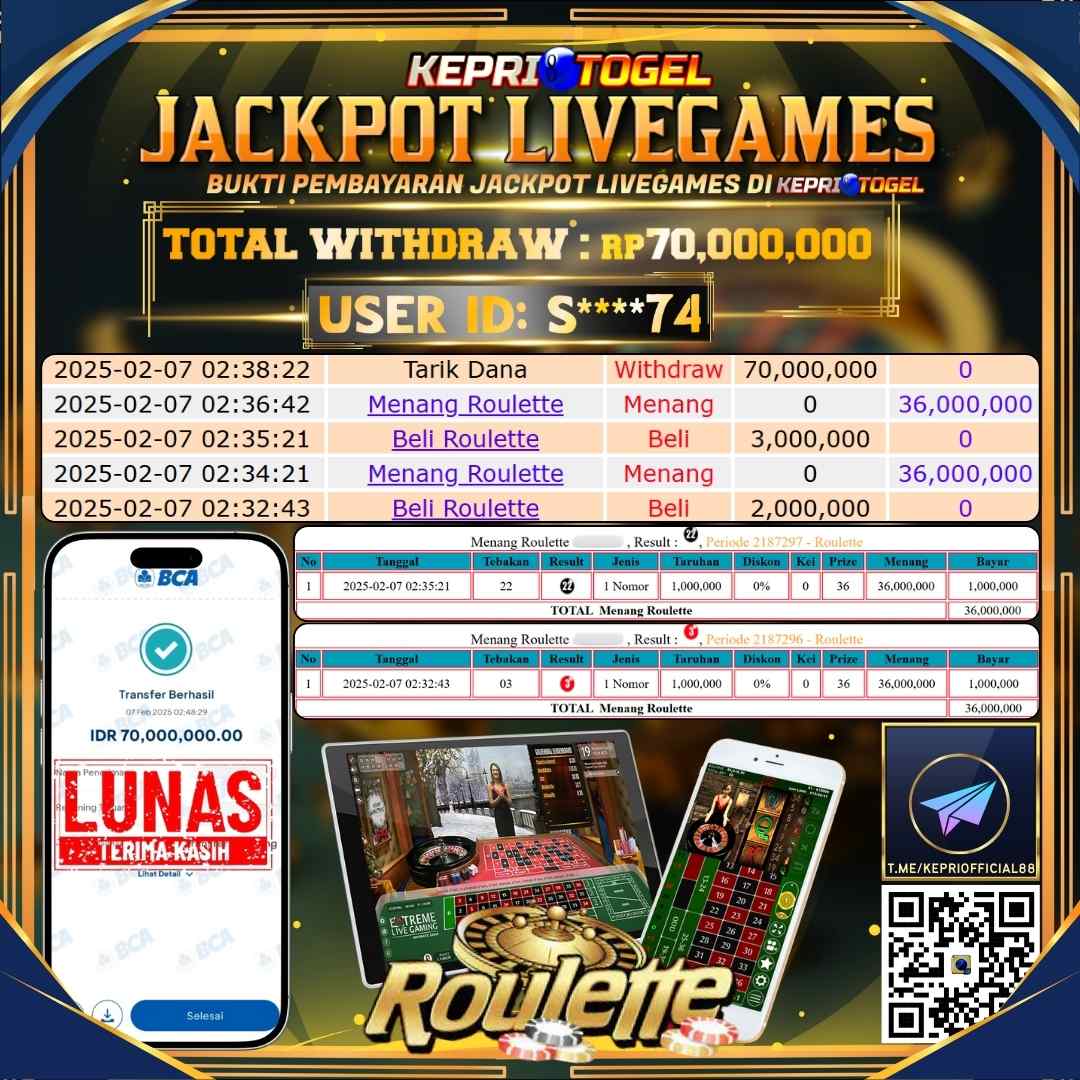 Selamat kepada UserId S****74 telah berhasil mendapatkan kemenangan jackpot pada permainan Live Game Roullete Kepritogel sebesar Rp70,000,000,- . Kepritogel situs terpercaya sejak dulu hingga saat ini , Untuk kemenangan berapapun pasti akan kami bayarkan . Jangan ragu bermain di Kepri Togel . Kami pihak Kepritogel Menyampaikan terima kasih kepada seluruh member Kepri Togel yang telah Percaya dan setia Bersama kami bermain di Kepritogel hingga saat inI.