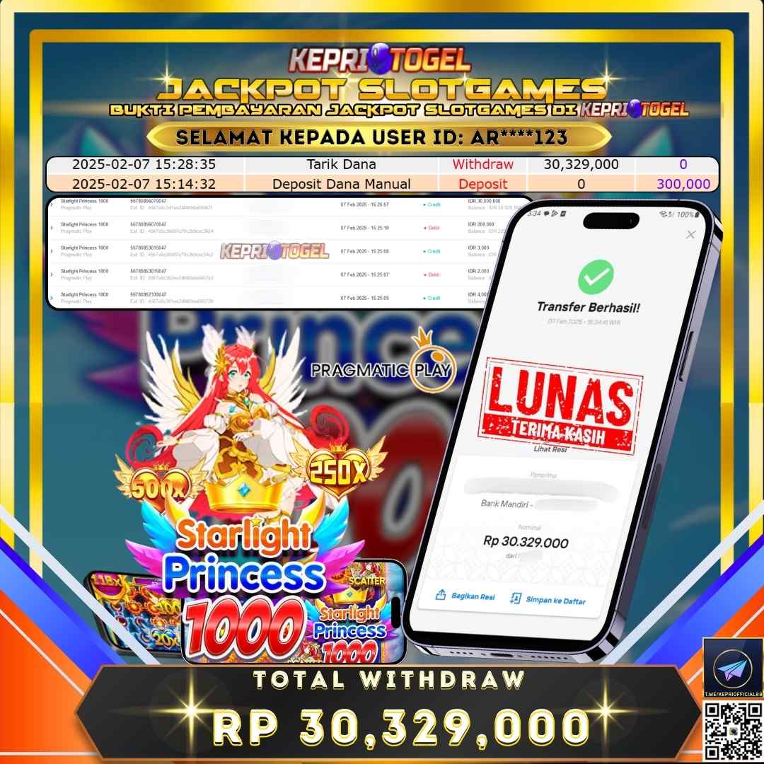 Selamat kepada UserId AR****123 telah berhasil mendapatkan kemenangan jackpot pada permainan Slot Starlight Princess 1000 Kepritogel sebesar Rp30,329,000,- . Kepritogel situs terpercaya sejak dulu hingga saat ini , Untuk kemenangan berapapun pasti akan kami bayarkan . Jangan ragu bermain di Kepri Togel . Kami pihak Kepritogel Menyampaikan terima kasih kepada seluruh member Kepri Togel yang telah Percaya dan setia Bersama kami bermain di Kepritogel hingga saat ini.