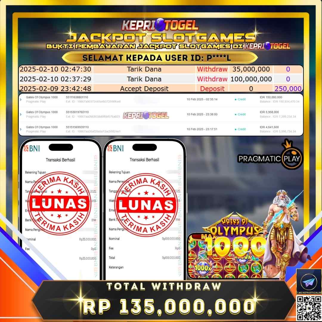 Selamat kepada UserId p****l telah berhasil mendapatkan kemenangan jackpot pada permainan Slot Gates Of Olympus 1000 Kepritogel sebesar Rp135,000,000,- . Kepritogel situs terpercaya sejak dulu hingga saat ini , Untuk kemenangan berapapun pasti akan kami bayarkan . Jangan ragu bermain di Kepri Togel . Kami pihak Kepritogel Menyampaikan terima kasih kepada seluruh member Kepri Togel yang telah Percaya dan setia Bersama kami bermain di Kepritogel hingga saat ini.