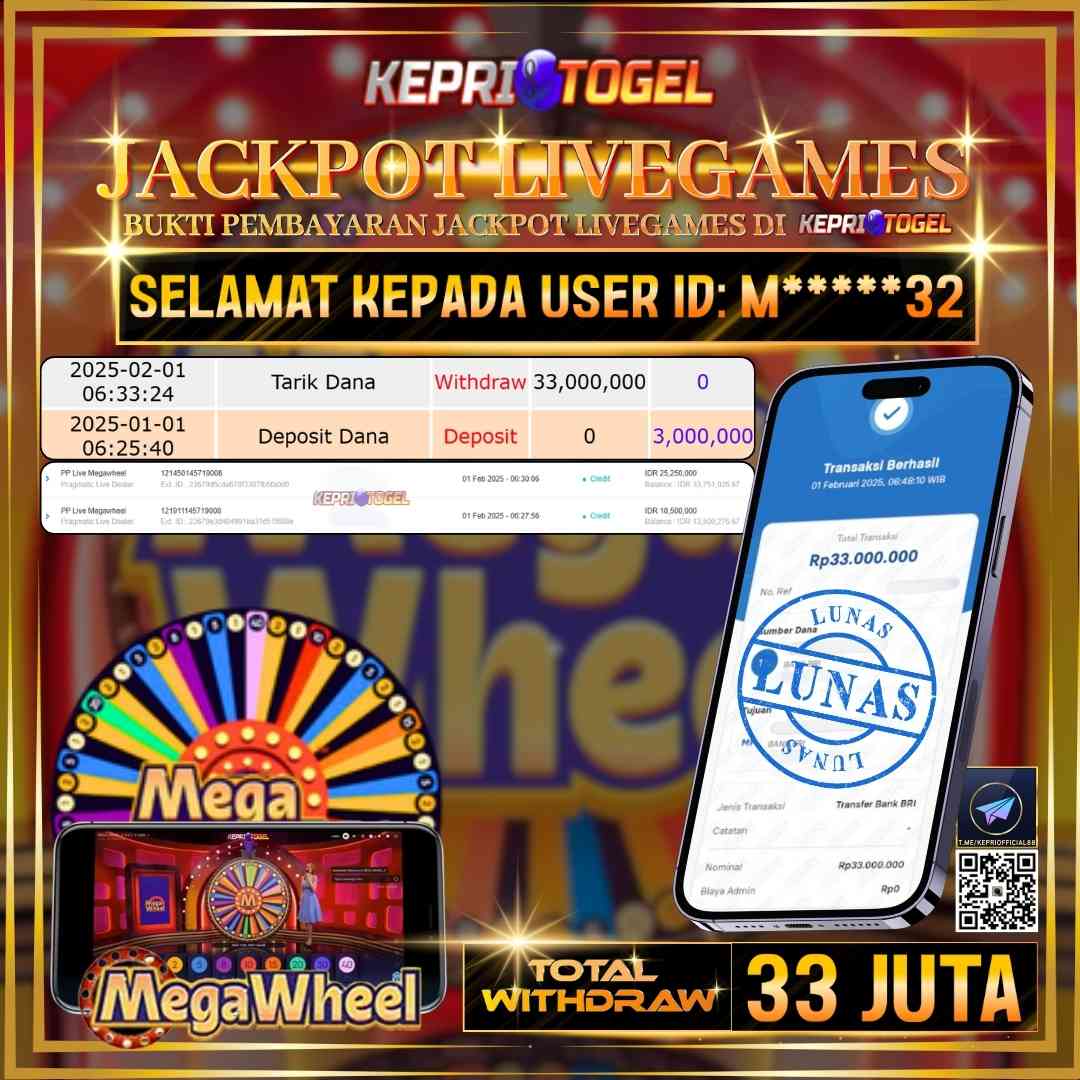 Selamat kepada UserId M*****32 telah berhasil mendapatkan kemenangan jackpot pada permainan Live Game PP Live Megawheel Kepritogel sebesar Rp33,000,000,- . Kepritogel situs terpercaya sejak dulu hingga saat ini , Untuk kemenangan berapapun pasti akan kami bayarkan . Jangan ragu bermain di Kepri Togel . Kami pihak Kepritogel Menyampaikan terima kasih kepada seluruh member Kepri Togel yang telah Percaya dan setia Bersama kami bermain di Kepritogel hingga saat inI.