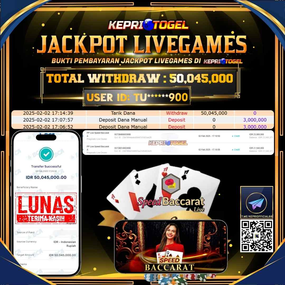 Selamat kepada UserId TU******900 telah berhasil mendapatkan kemenangan jackpot pada permainan Live Game PP Live Speed Baccarat A Kepritogel sebesar Rp50,045,000,- . Kepritogel situs terpercaya sejak dulu hingga saat ini , Untuk kemenangan berapapun pasti akan kami bayarkan . Jangan ragu bermain di Kepri Togel . Kami pihak Kepritogel Menyampaikan terima kasih kepada seluruh member Kepri Togel yang telah Percaya dan setia Bersama kami bermain di Kepritogel hingga saat inI.