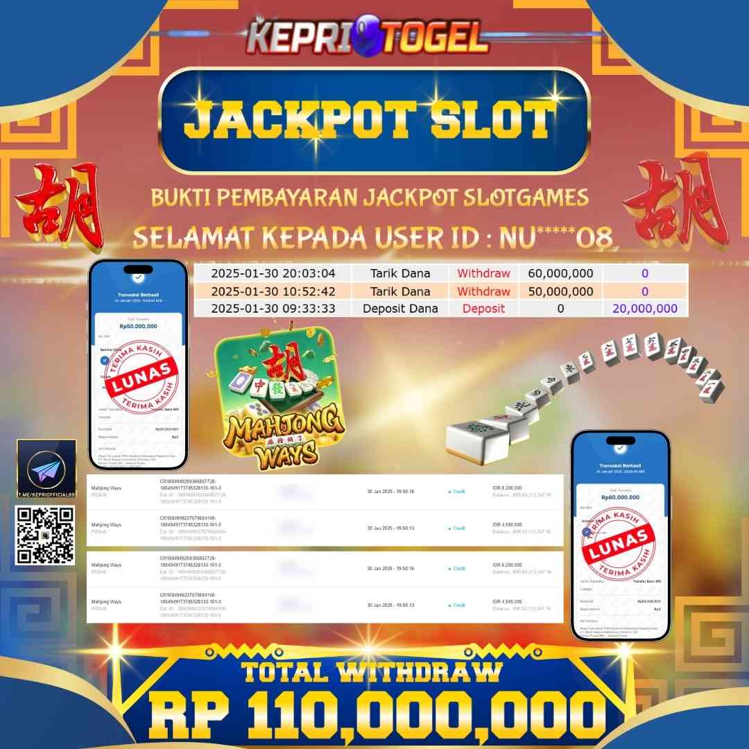 Selamat kepada UserId NU*****08 telah berhasil mendapatkan kemenangan jackpot pada permainan Slot Mahjong Ways Kepritogel sebesar Rp110,000,000,- . Kepritogel situs terpercaya sejak dulu hingga saat ini , Untuk kemenangan berapapun pasti akan kami bayarkan . Jangan ragu bermain di Kepri Togel . Kami pihak Kepritogel Menyampaikan terima kasih kepada seluruh member Kepri Togel yang telah Percaya dan setia Bersama kami bermain di Kepritogel hingga saat ini.