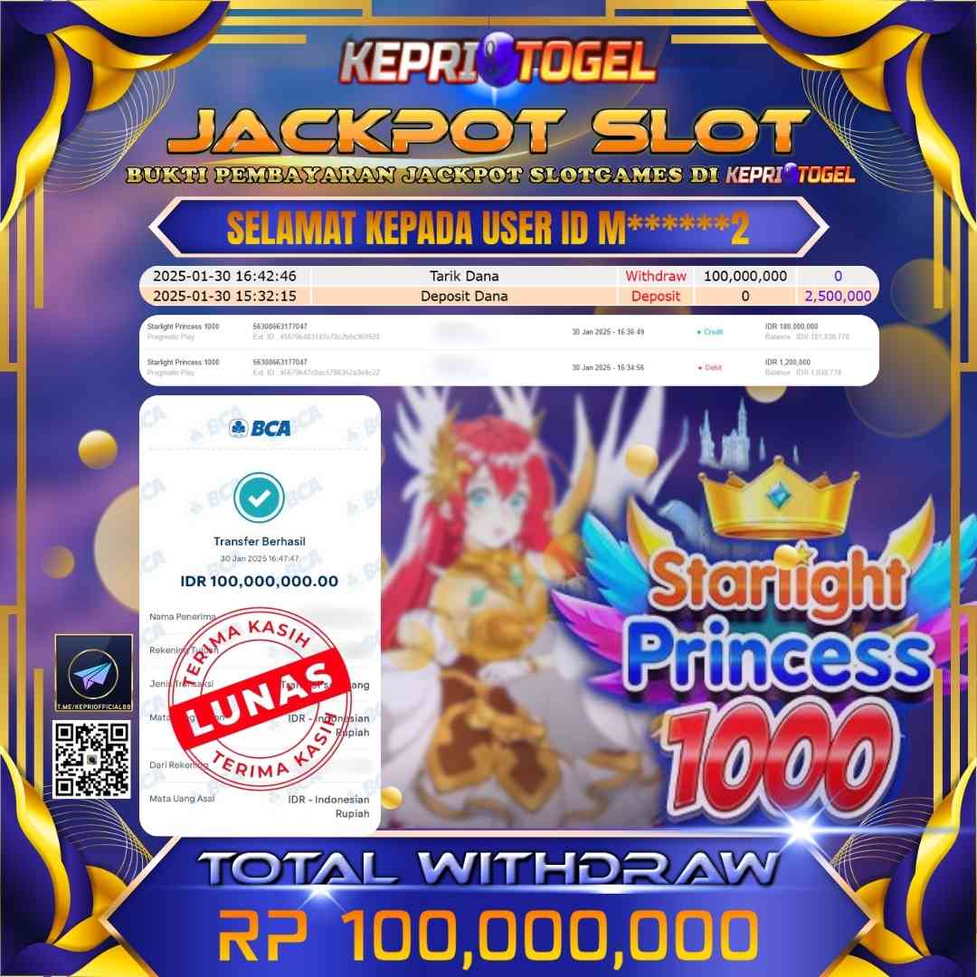 Selamat kepada UserId M******2 telah berhasil mendapatkan kemenangan jackpot pada permainan Slot Starlight Princess 1000 Kepritogel sebesar Rp100,000,000,- . Kepritogel situs terpercaya sejak dulu hingga saat ini , Untuk kemenangan berapapun pasti akan kami bayarkan . Jangan ragu bermain di Kepri Togel . Kami pihak Kepritogel Menyampaikan terima kasih kepada seluruh member Kepri Togel yang telah Percaya dan setia Bersama kami bermain di Kepritogel hingga saat ini.