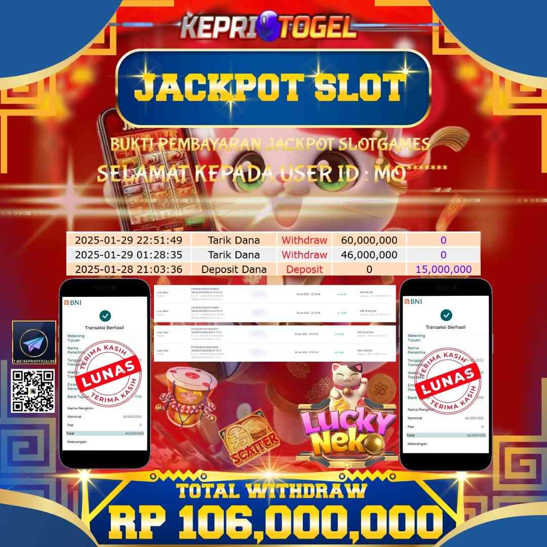 Selamat kepada UserId MO******* telah berhasil mendapatkan kemenangan jackpot pada permainan Slot Lucky Neko Kepritogel sebesar Rp106,000,000,- . Kepritogel situs terpercaya sejak dulu hingga saat ini , Untuk kemenangan berapapun pasti akan kami bayarkan . Jangan ragu bermain di Kepri Togel . Kami pihak Kepritogel Menyampaikan terima kasih kepada seluruh member Kepri Togel yang telah Percaya dan setia Bersama kami bermain di Kepritogel hingga saat ini.