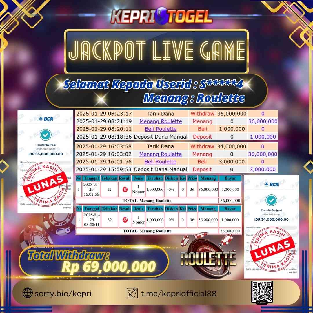 Selamat kepada UserId S*****4 telah berhasil mendapatkan kemenangan jackpot pada permainan Live Game Roulette Kepritogel sebesar Rp69,000,000,- . Kepritogel situs terpercaya sejak dulu hingga saat ini , Untuk kemenangan berapapun pasti akan kami bayarkan . Jangan ragu bermain di Kepri Togel . Kami pihak Kepritogel Menyampaikan terima kasih kepada seluruh member Kepri Togel yang telah Percaya dan setia Bersama kami bermain di Kepritogel hingga saat inI.