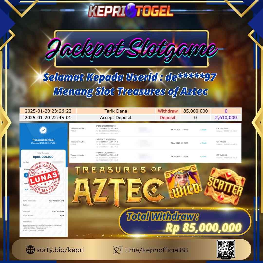 Selamat kepada UserId DE*****97 telah berhasil mendapatkan kemenangan jackpot pada permainan Slot Treasures of Aztec Kepritogel sebesar Rp85,000,000,- . Kepritogel situs terpercaya sejak dulu hingga saat ini , Untuk kemenangan berapapun pasti akan kami bayarkan . Jangan ragu bermain di Kepri Togel . Kami pihak Kepritogel Menyampaikan terima kasih kepada seluruh member Kepri Togel yang telah Percaya dan setia Bersama kami bermain di Kepritogel hingga saat ini.