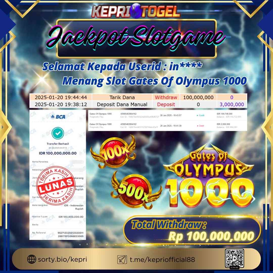 Selamat kepada UserId IN**** telah berhasil mendapatkan kemenangan jackpot pada permainan Slot Gates Of Olympus 1000 Kepritogel sebesar Rp100,000,000,- . Kepritogel situs terpercaya sejak dulu hingga saat ini , Untuk kemenangan berapapun pasti akan kami bayarkan . Jangan ragu bermain di Kepri Togel . Kami pihak Kepritogel Menyampaikan terima kasih kepada seluruh member Kepri Togel yang telah Percaya dan setia Bersama kami bermain di Kepritogel hingga saat ini.