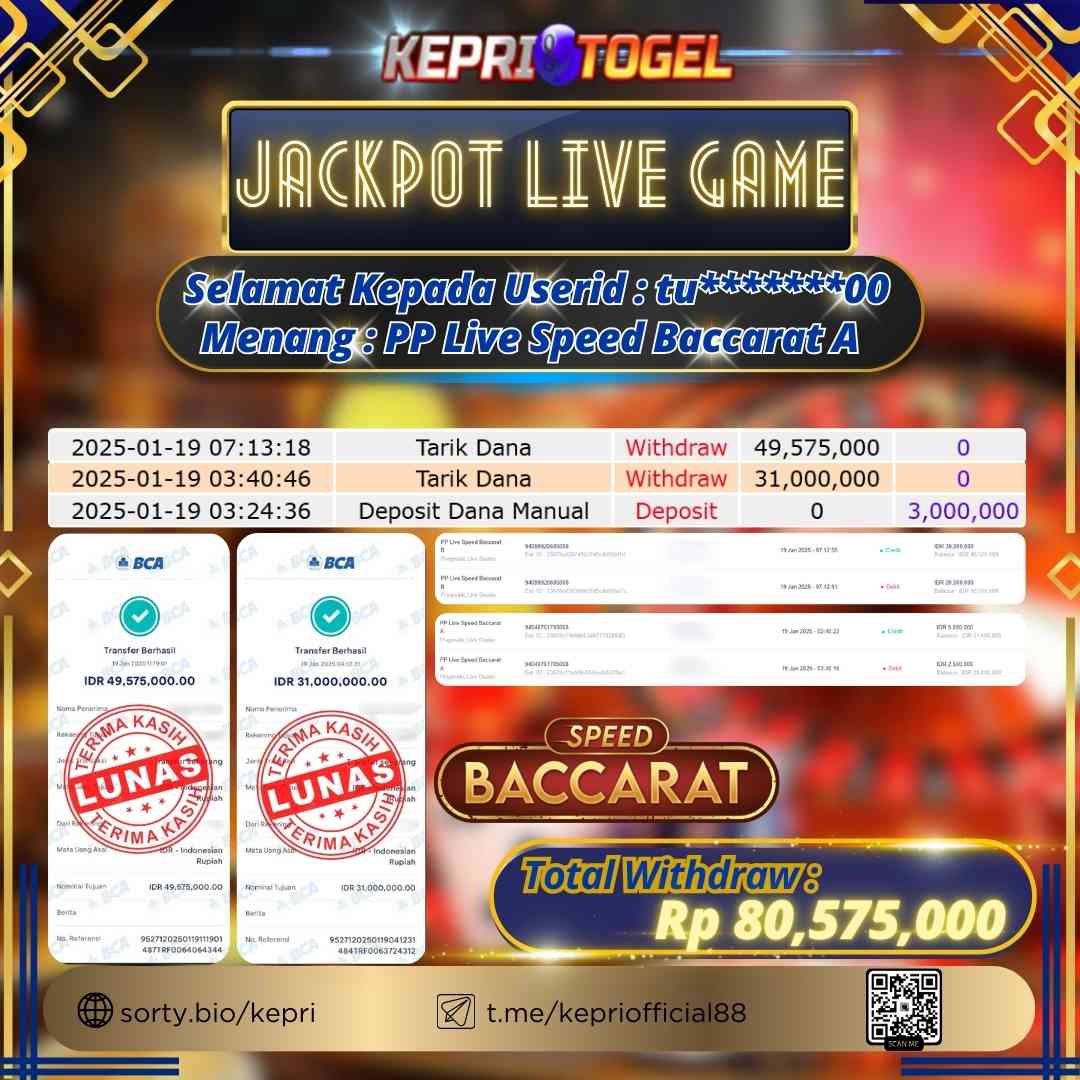 Selamat kepada UserId TU*******00 telah berhasil mendapatkan kemenangan jackpot pada permainan Live Game Speed Baccarat Kepritogel sebesar Rp80,575,000,- . Kepritogel situs terpercaya sejak dulu hingga saat ini , Untuk kemenangan berapapun pasti akan kami bayarkan . Jangan ragu bermain di Kepri Togel . Kami pihak Kepritogel Menyampaikan terima kasih kepada seluruh member Kepri Togel yang telah Percaya dan setia Bersama kami bermain di Kepritogel hingga saat inI.