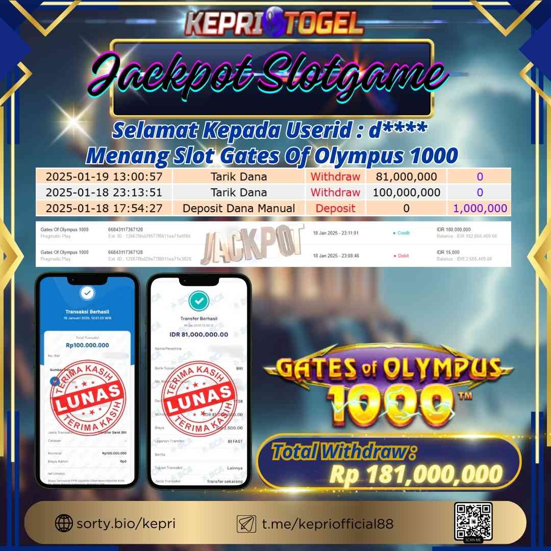 Selamat kepada UserId D**** telah berhasil mendapatkan kemenangan jackpot pada permainan Slot Gates Of Olympus 1000 Kepritogel sebesar Rp181,000,000,- . Kepritogel situs terpercaya sejak dulu hingga saat ini , Untuk kemenangan berapapun pasti akan kami bayarkan . Jangan ragu bermain di Kepri Togel . Kami pihak Kepritogel Menyampaikan terima kasih kepada seluruh member Kepri Togel yang telah Percaya dan setia Bersama kami bermain di Kepritogel hingga saat ini.