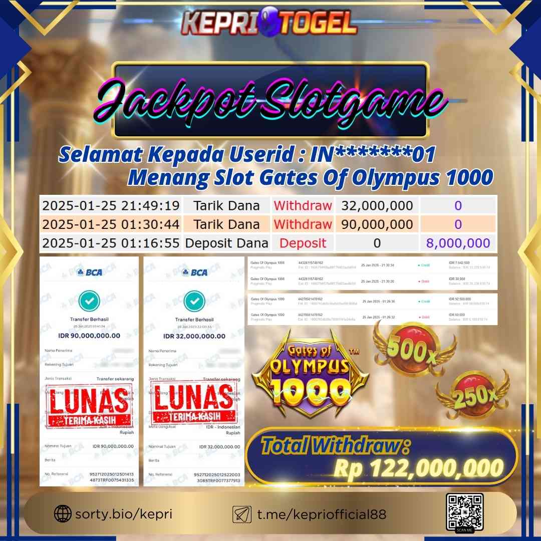 Selamat kepada UserId IN**** telah berhasil mendapatkan kemenangan jackpot pada permainan Slot Gates Of Olympus 1000 Kepritogel sebesar Rp82,000,000,- . Kepritogel situs terpercaya sejak dulu hingga saat ini , Untuk kemenangan berapapun pasti akan kami bayarkan . Jangan ragu bermain di Kepri Togel . Kami pihak Kepritogel Menyampaikan terima kasih kepada seluruh member Kepri Togel yang telah Percaya dan setia Bersama kami bermain di Kepritogel hingga saat ini.